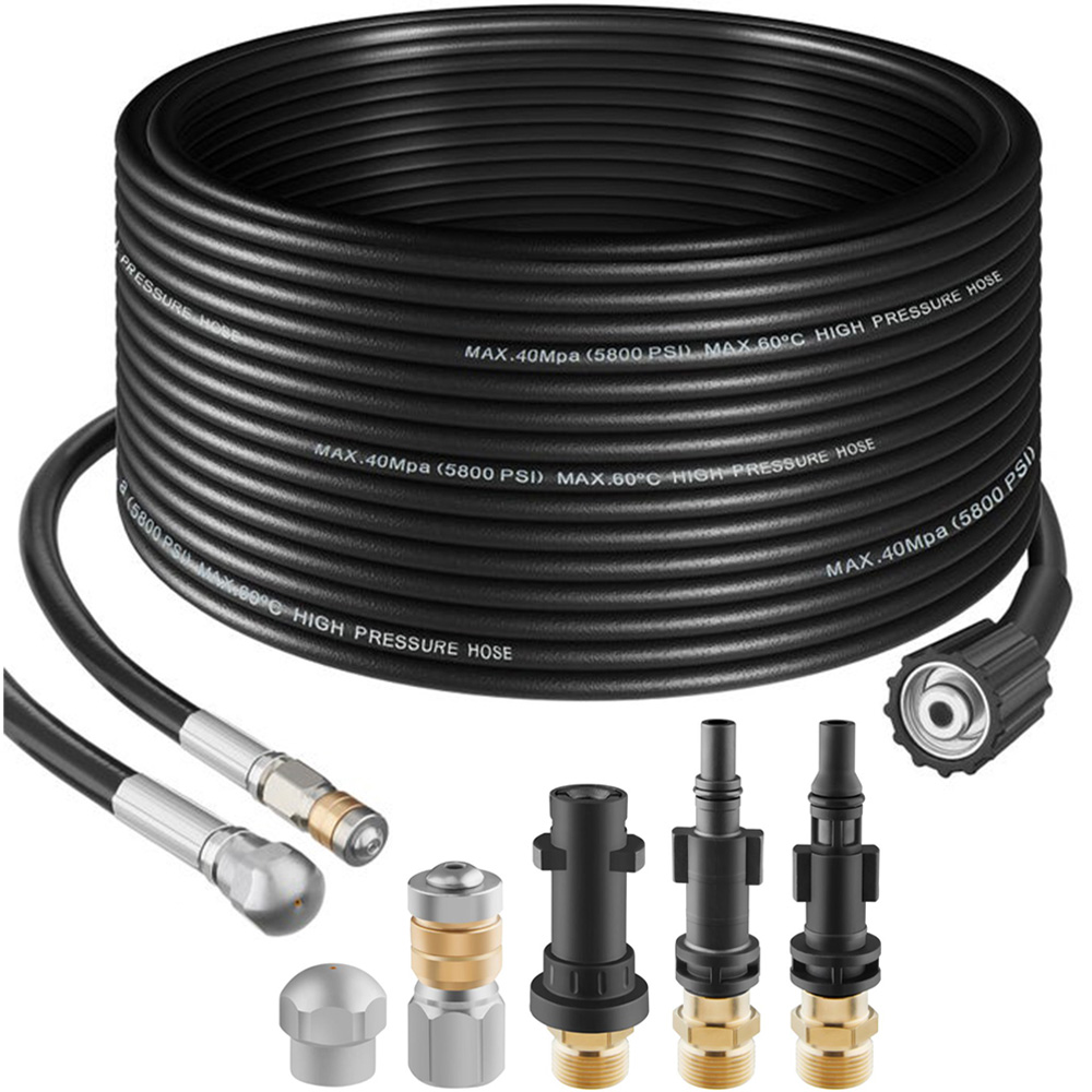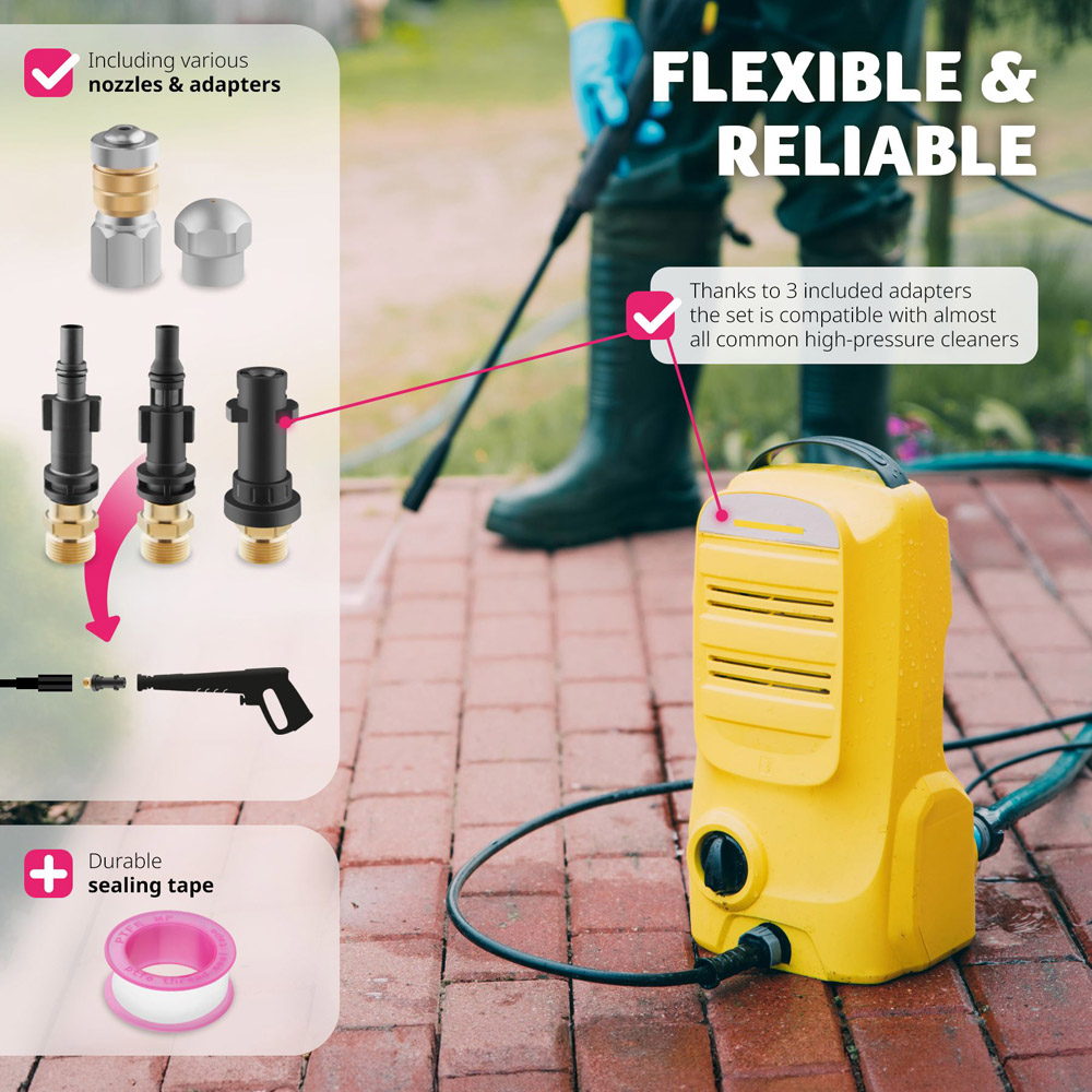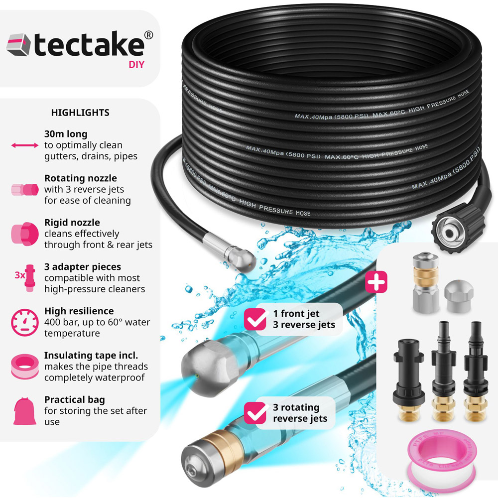 Keep your drains flowing freely with the tectake drain cleaning hose set, the ideal kit for quick and efficient drain maintenance. This 300 cm hose is expertly designed to swiftly tackle various blockages, ensuring you don't have to wait for professional help and saving you time and hassle. The set features two durable stainless steel nozzles: a fixed nozzle for targeted cleaning and a rotating nozzle for comprehensive coverage, making it versatile for any situation. Supplied with three adapters, it ensures compatibility with most standard pressure washers, while the included insulating tape guarantees a tight, leak-free connexion. This comprehensive eight-piece kit is conveniently stored in a fabric bag for easy organisation and portability.