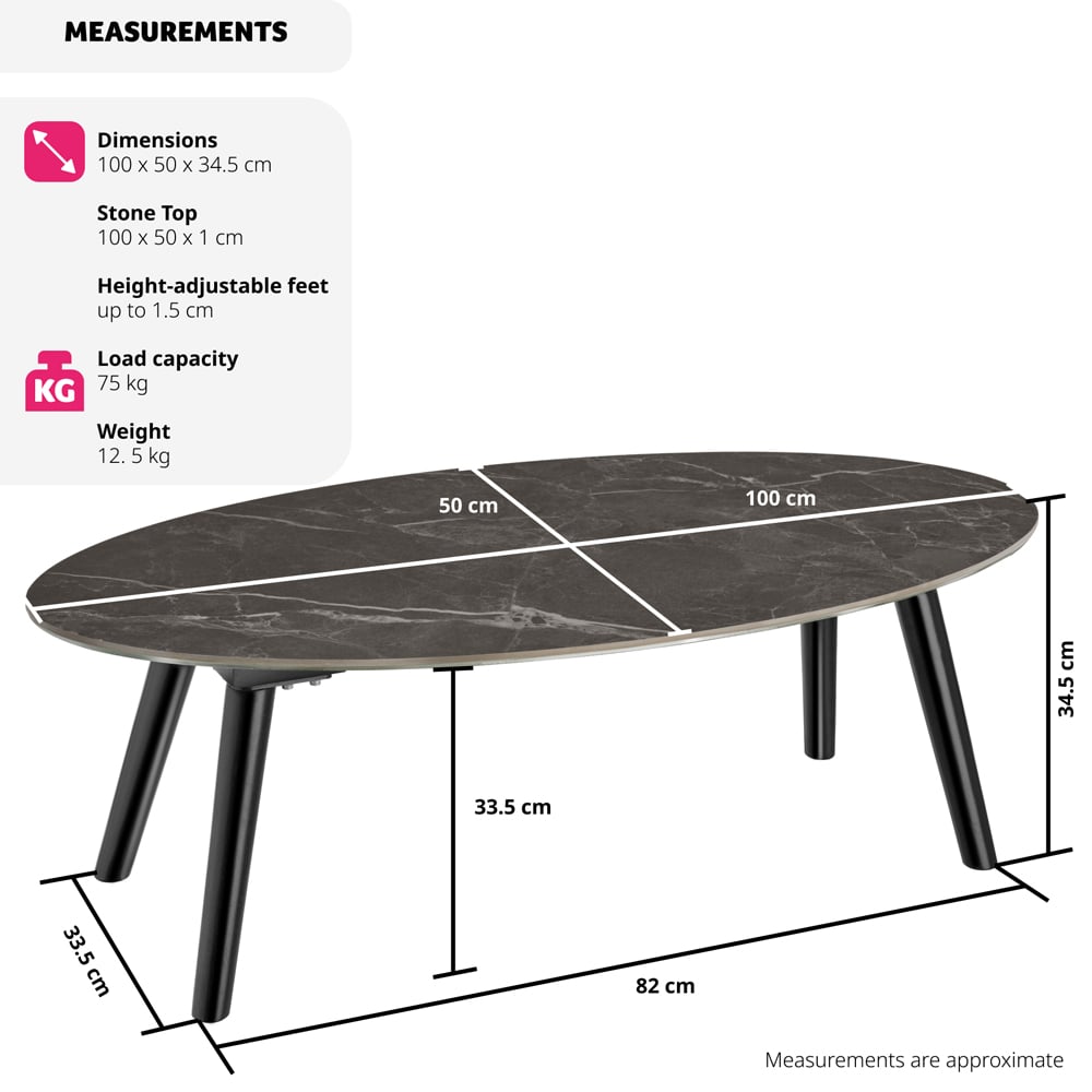 Discover the versatile tectake Acerra Black Marble Effect Oval Coffee Table - a perfect blend of classic design and practicality, making it an excellent enhancement for your living area or patio. The generously sized stone tabletop, featuring a refined marble appearance, not only captivates with its elegant style but also boasts remarkable durability, providing sufficient space for arranging decorations, beverages, or snacks. The sturdy wooden legs of the low dining table guarantee a high load-bearing capacity and come equipped with adjustable and slip-resistant feet, ensuring stability on any surface. Whether used as a side table in the living room or combined with chairs or other pieces in the garden, this chic furniture piece stands out with its superior quality and appealing design.