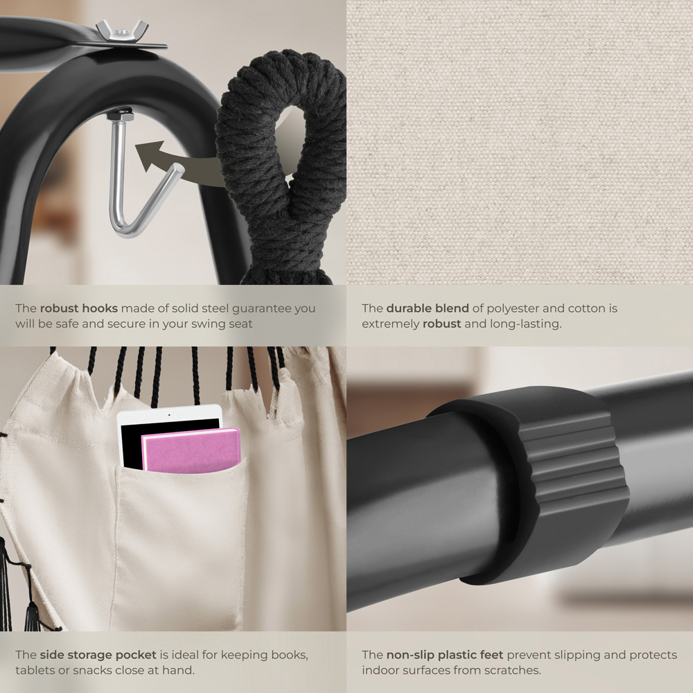 Meet Alison, the beige swing chair from tectake, promising pure relaxation. Imagine a blend of hammock comfort and chair support, creating a freestanding haven perfect for reading or simply unwinding. Alison boasts elegant macrame styling, adding a touch of sophistication to any space.