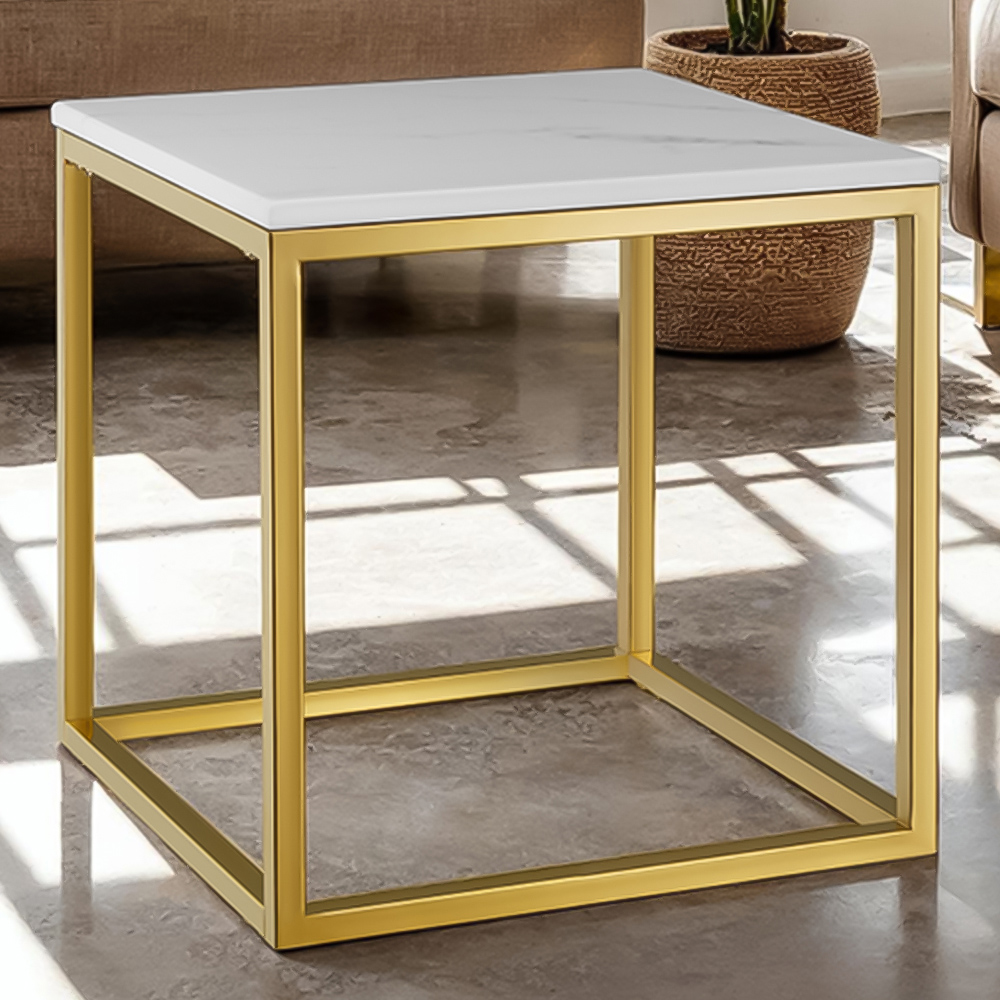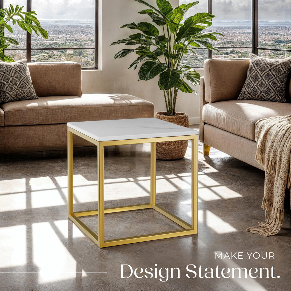 Add a touch of elegance to your space with the tectake Alysia White and Gold Marble Top Square Side Table. This modern square side table blends wood and metal into a timeless look, making it a stylish and functional addition to any room. Whether used beside a sofa, as a bedside table or as an accent piece in the hallway, this table enhances any decor with its timeless charm. The marble top features a fine natural structure and rests securely on a solid steel frame with a durable coating. Its height-adjustable feet ensure stability on a variety of surfaces, including tiles, parquet, and carpet. The removable tabletop allows for easy cleaning, while the simple assembly process makes setup quick and hassle-free.