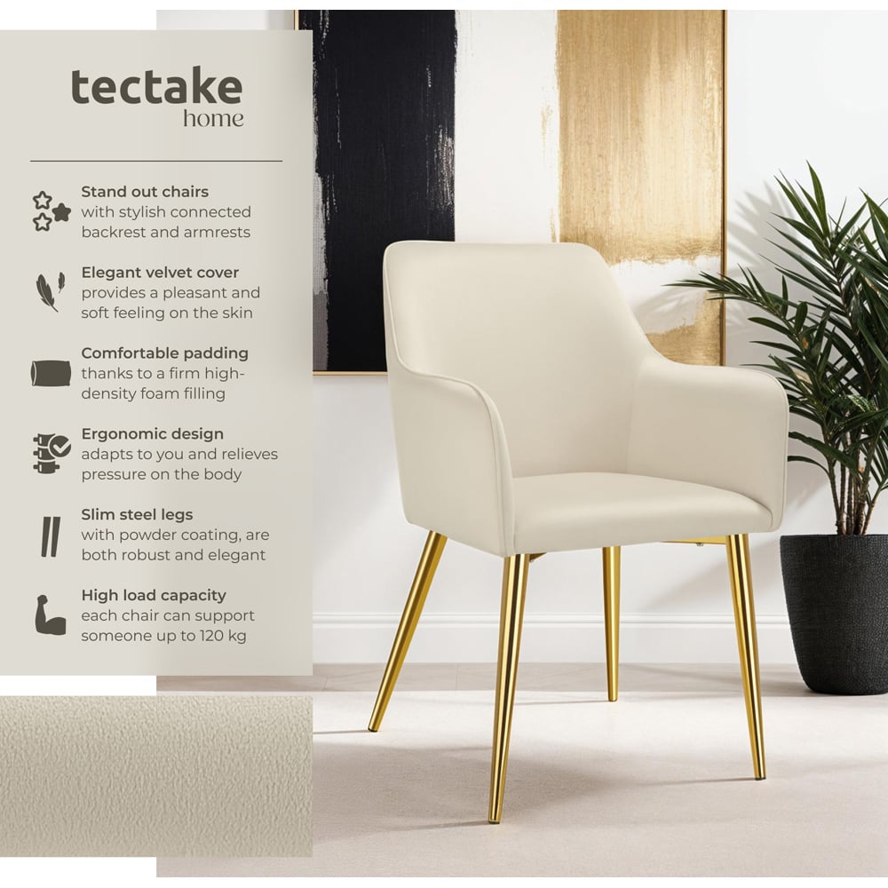 Combine elegant design with everyday comfort with tectake Avane Beige Velvet High Backrest and Armrest Padded Dining Chair Set of 2. It features a high backrest and integrated armrests for a relaxed seating experience during extended meals. Generous padding and soft velvet-look upholstery lend a luxurious feel, making them a stylish addition to dining rooms, kitchens, or living spaces. Supported by slim, powder-coated steel legs, the chairs offer reliable stability and a strong load capacity, while non-slip plastic feet help protect floors from marks or scratches. Designed for convenience, the chairs are quick to assemble and available in a range of refined colours, allowing them to complement various interior styles—whether paired with dark leather, warm wood tones, or bold accents. Crafted from durable faux velvet, they suit both modern and traditional settings with ease.