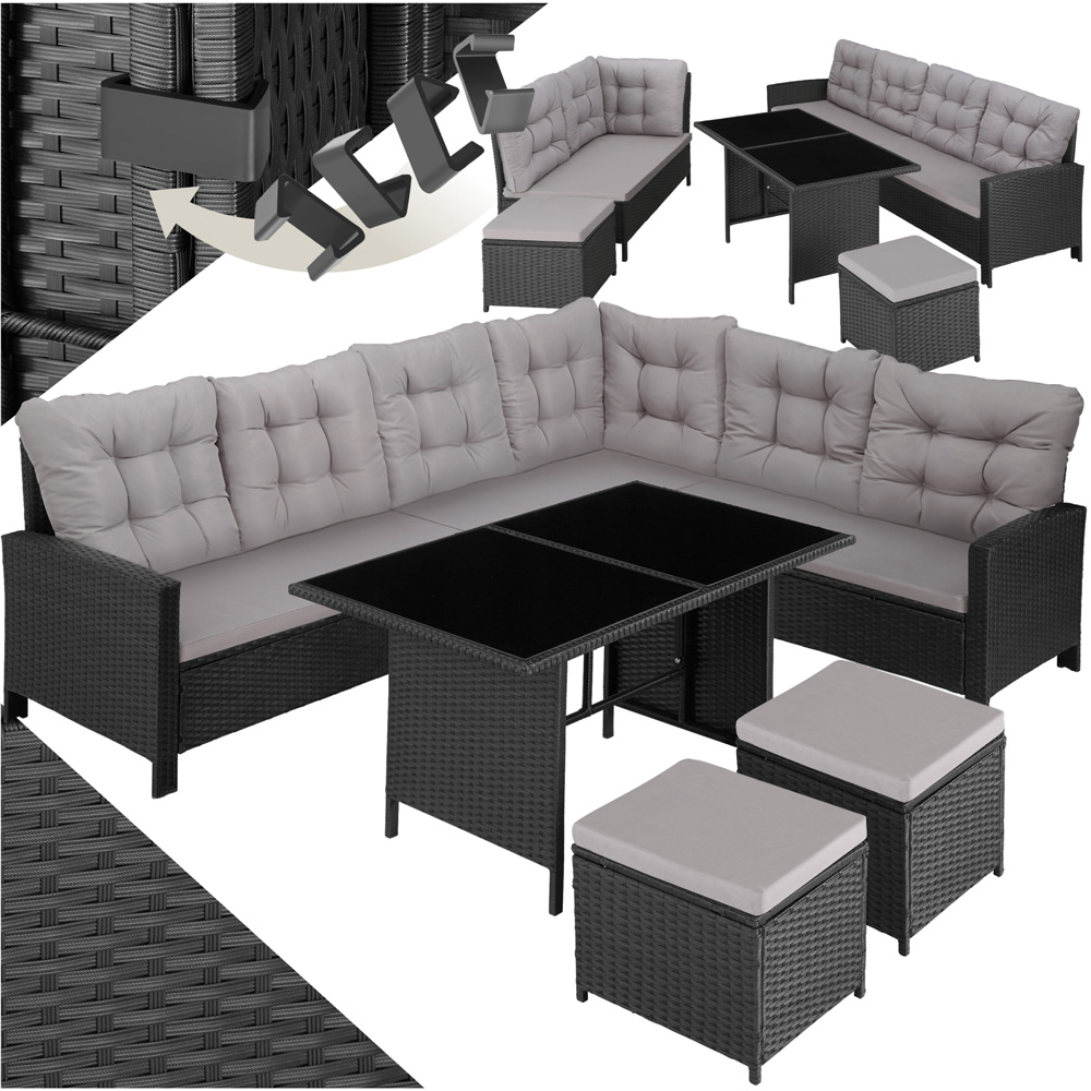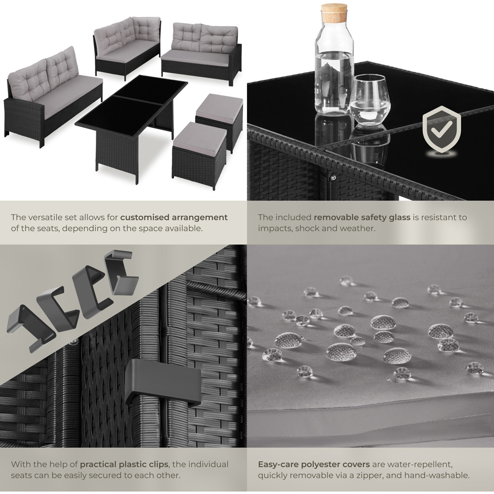 Create a sophisticated outdoor haven with the Barletta rattan lounge set. Perfect for al fresco dining, this elegant set comfortably seats six to eight. Crafted from durable, UV-resistant polyrattan with a robust steel frame, it’s built to withstand the elements. Three easily reconfigurable sofa pieces, secured with included clips, let you tailor your seating arrangement. Plump, water-repellent cushions, with removable and washable covers, ensure lasting comfort and easy maintenance. The substantial back cushions offer superb support, whether you're hosting a dinner party or simply relaxing with a book. The table’s two detachable, tinted safety glass tops provide ample space, while two handy ottomans, each with a cushion, add extra seating or comfy footrests. Measuring 115.5 x 65.5 x 66cm, the Barletta is the ultimate in stylish outdoor relaxation.