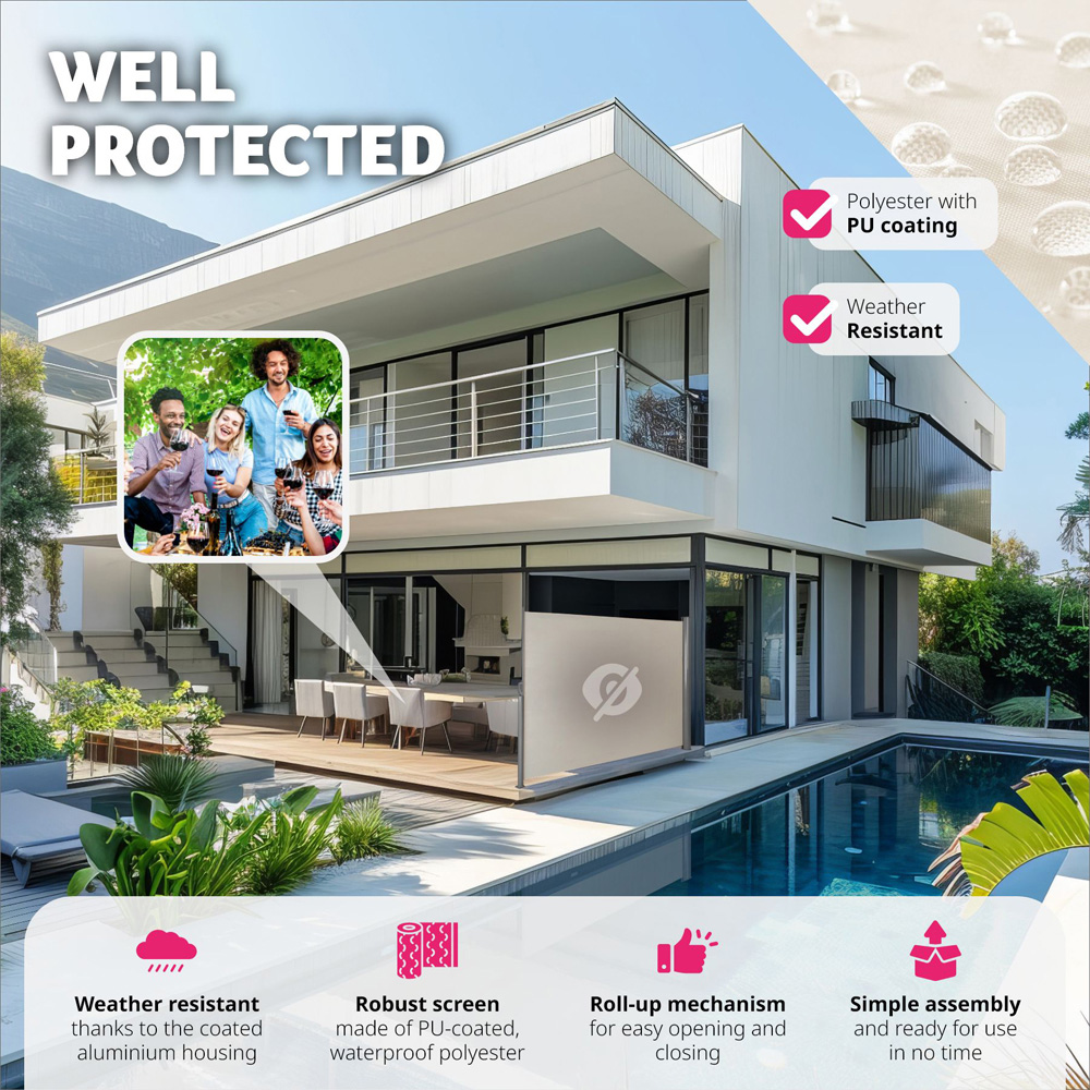 Transform your garden or patio into a private, peaceful retreat with this retractable side awning. Designed to offer shelter from prying eyes, low-lying sun, and gusty winds, this robust awning is an essential addition to any outdoor setting. Constructed with water-repellent, premium polyester and a rust-resistant aluminium frame, this side screen is engineered for enduring performance and lasting durability.