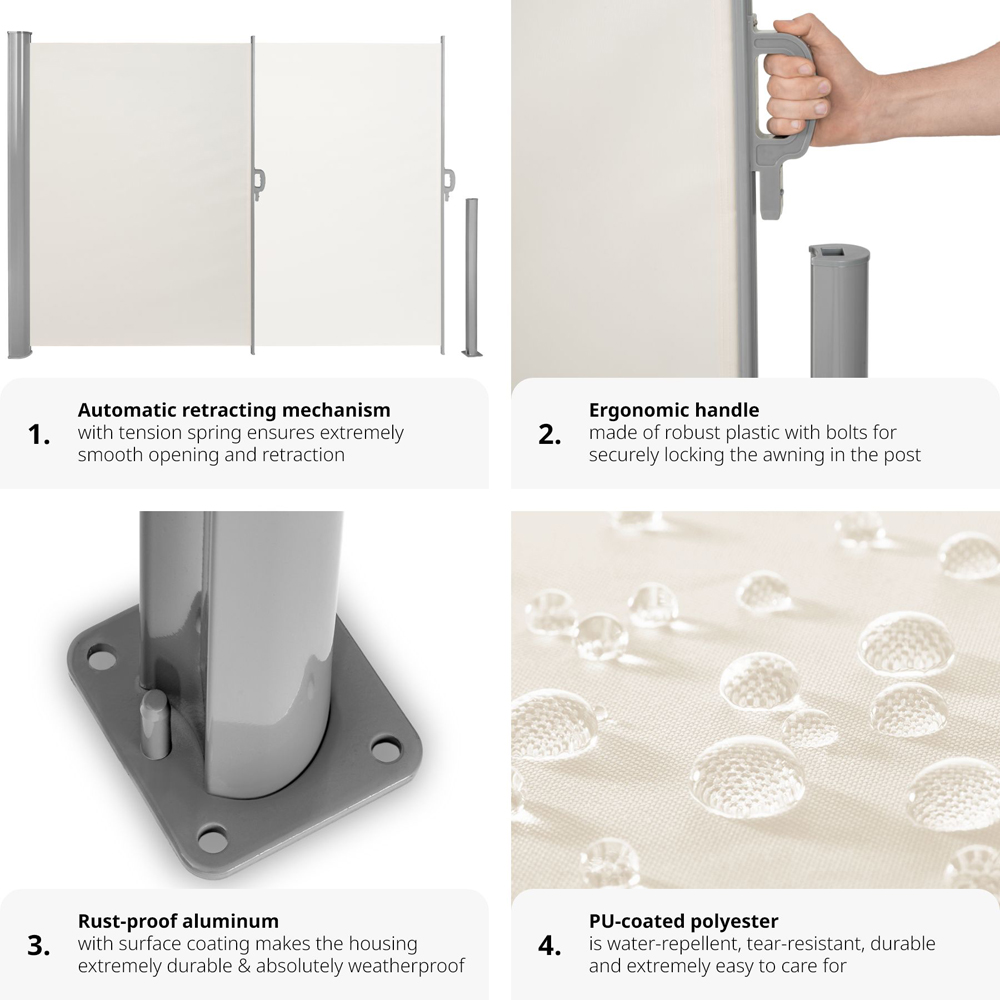 Manufactured with high-quality, water-repellent polyester fabric and a rust-resistant aluminium frame, this side screen offers long-lasting durability and reliable performance. The automatic roll-up mechanism ensures effortless operation; simply extend the screen using the convenient handle and secure it to the supporting post. When not in use, the tension spring facilitates smooth and easy retraction.