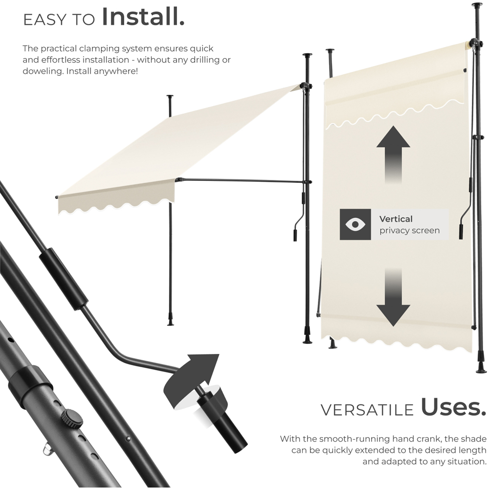 Crafted with your comfort in mind, this manual awning is an aesthetic and practical solution, providing shelter from sun and rain and enhancing your patio, garden, or outdoor area. Built to last, it features a smooth-running hand crank and is constructed from durable powder-coated steel, aluminium, and rain and UV-resistant polyester fabric. Installation is straightforward thanks to a simple clamp system, eliminating the need for drilling into exterior walls. Enjoy the flexibility of a retractable patio canopy, allowing you to effortlessly switch between sunshine and shade. Perfect for use above a patio door, window, or as a roof extension, this easy-to-install awning offers excellent sun protection and can be adjusted for the ideal amount of shade, bringing both style and practicality to your outdoor space. Shop now for a versatile awning that brings comfort and protection.