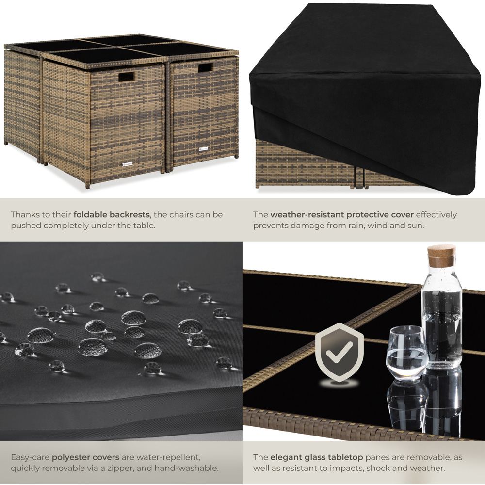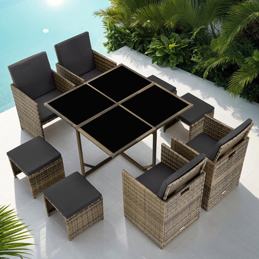 Create a stylish and sophisticated outdoor space with the Bilbao 8-seater garden dining set. This stunning rattan set blends Mediterranean elegance with practical design, perfect for al fresco dining and entertaining. Four comfortable rattan dining chairs, complete with seat and back cushions, are complemented by four equally comfortable cushioned stools, offering versatile seating for up to eight guests. The table, featuring four panels of dark-tinted safety glass, completes the look. For easy storage, the chairs neatly tuck under the table, keeping your patio tidy and organised. Enjoy relaxed gatherings with family and friends in comfort and style.