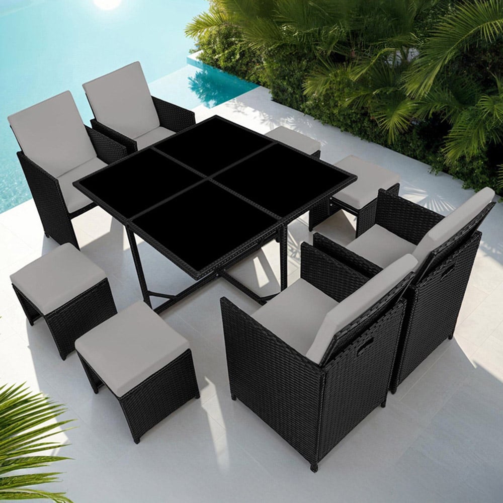 Transform your outdoor space with the Bilbao garden dining set from tectake. This elegant rattan furniture set features four rattan dining chairs, each complete with comfortable seat and back cushions, alongside four cushioned stools. The table boasts a sleek surface comprised of four dark-tinted safety glass panels.