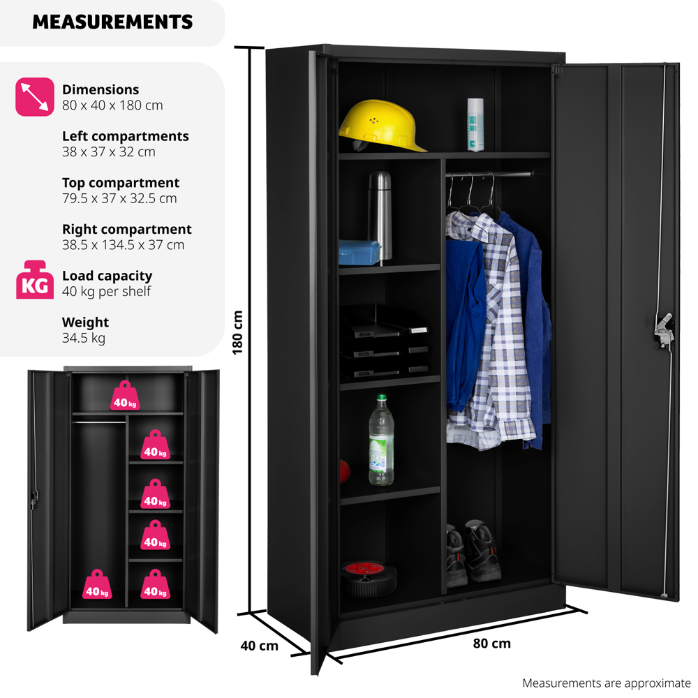 Crafted from high-quality steel, the cabinet boasts reinforced swing doors that open to 130 degrees, complete with noise-dampening rubber buffers for quiet operation. Security is paramount, thanks to the integrated security cylinder lock, turning handle, and two provided keys.