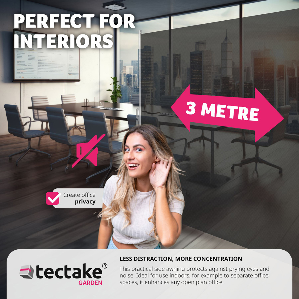Transform your garden or patio into a private retreat with this retractable side awning. Designed to offer shelter from prying eyes, the low sun, and gusty winds, this awning is an essential addition to any outdoor setting. Constructed with high-quality, water-repellent polyester and a durable, rust-proof aluminium frame, this side screen is engineered for longevity and dependable performance.