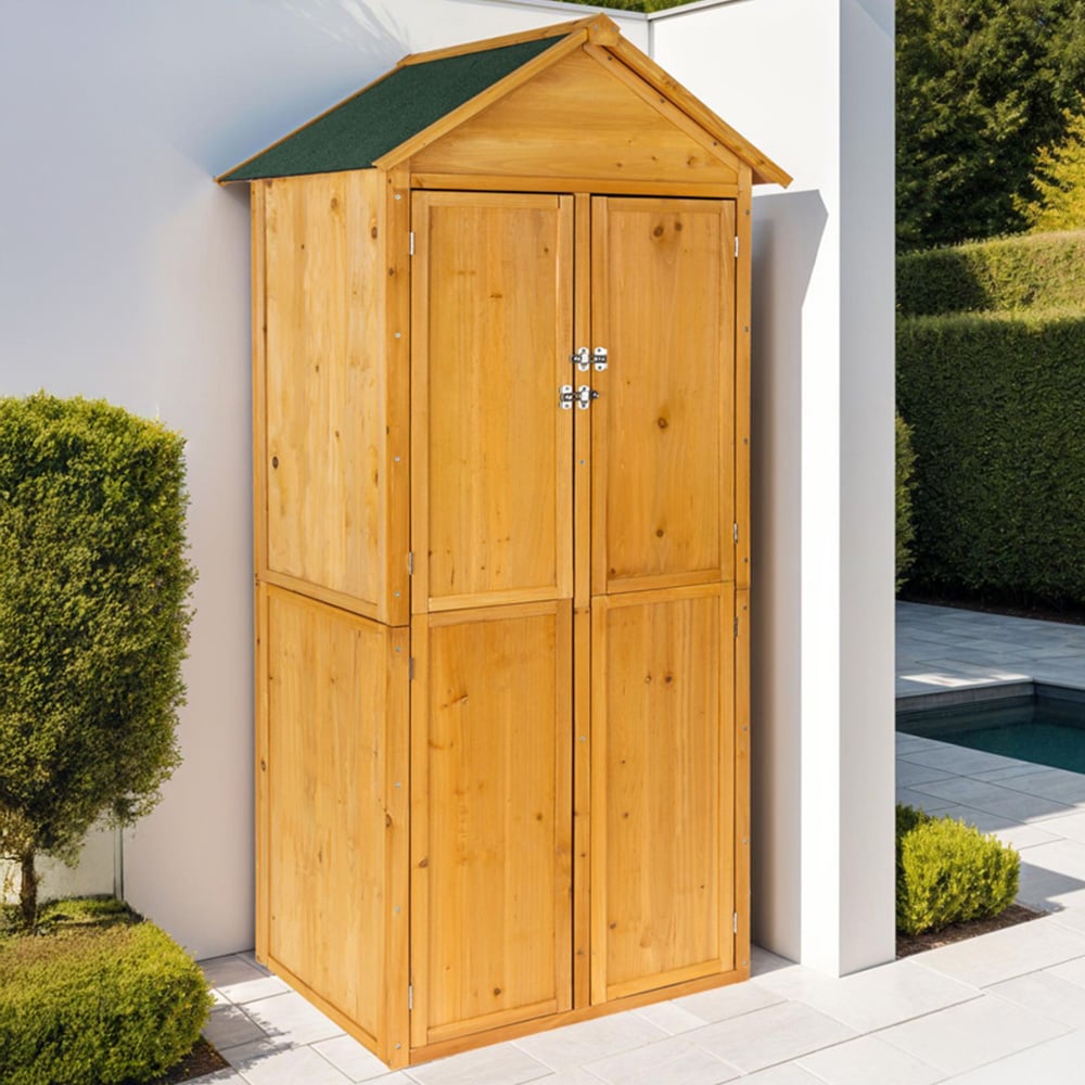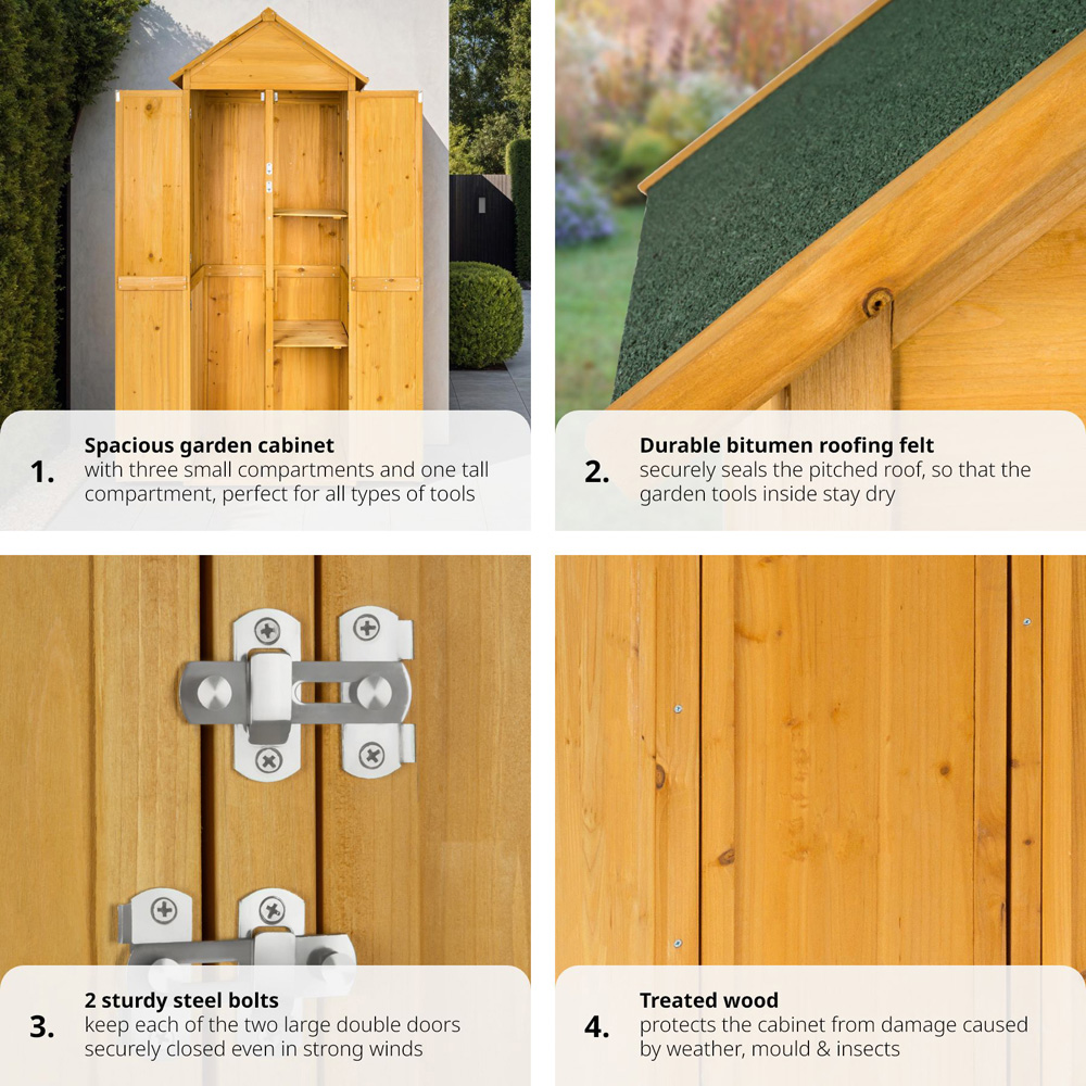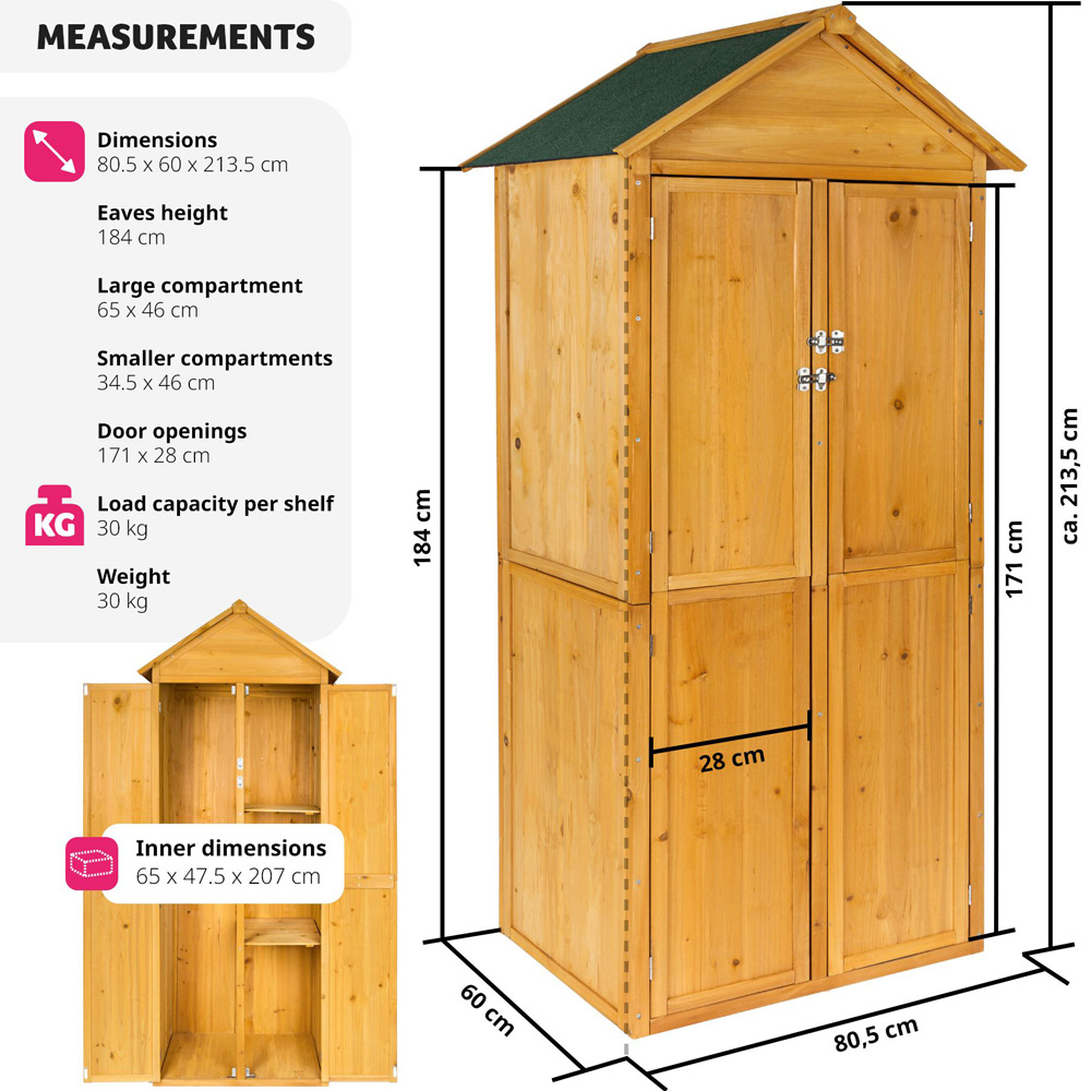 This practical garden shed offers ample storage for all your gardening essentials. Its pitched roof design, covered in durable, weather-resistant bitumen roofing felt, protects your tools from the elements. Inside, you'll find well-designed storage solutions: two shelves on the right for smaller items, and ample space on the left for taller equipment. Two doors provide easy access, secured by a reliable steel bolt. Keep your garden tools organised and protected with this space-saving solution.