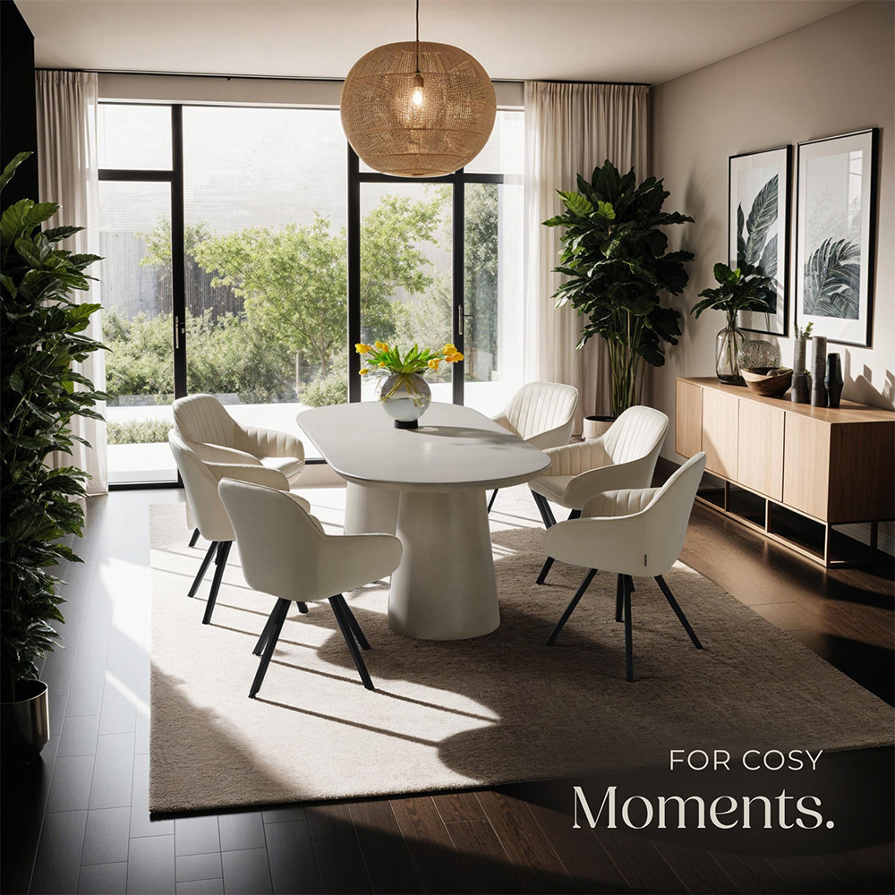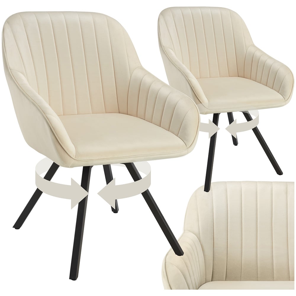 Elevate your space with comfort with the tectake Cream Velvet 360 Swivel Accent Lounge Armchair Set of 2. It offers a refined balance of style, comfort, and practicality, making it a tasteful addition to any dining or living area. Upholstered in soft velvet, each chair features a spacious seat shell and a continuous arm and backrest, enhanced with high-density padding for a plush seating experience. A smooth 360° swivel function adds flexibility, allowing easy movement without compromising on comfort. The design is complemented by slim, diagonally angled steel legs that provide strong support and a modern aesthetic. Non-slip plastic feet help keep the chairs stable while protecting flooring from scratches, ensuring both elegance and durability in everyday use.