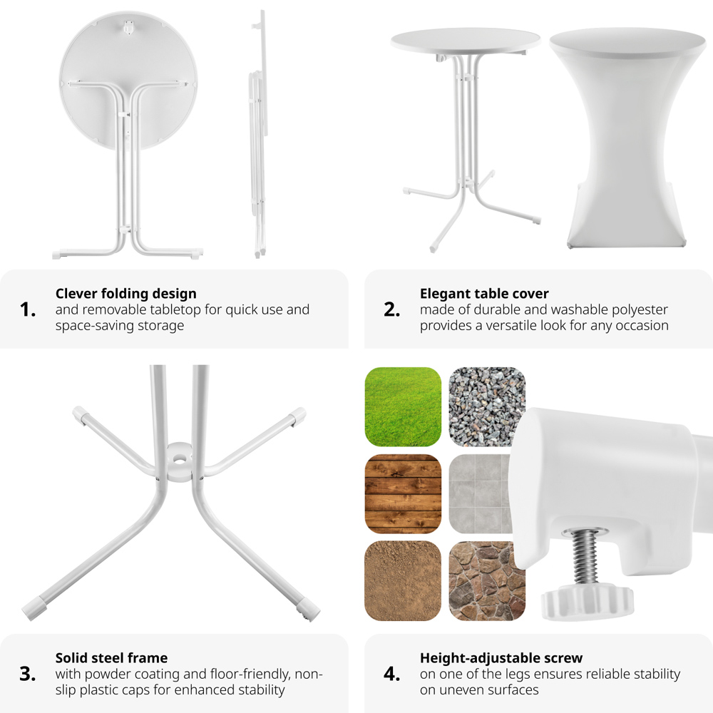 Elevate your outdoor or event space with the chic Eren bar table from tectake, complete with a stylish table cover. This round bistro table effortlessly blends form and function, making it a striking addition to any setting. The design features a foldable and robust steel frame, offering both exceptional durability and convenient storage. Its sturdy, removable MDF tabletop ensures long-lasting use.