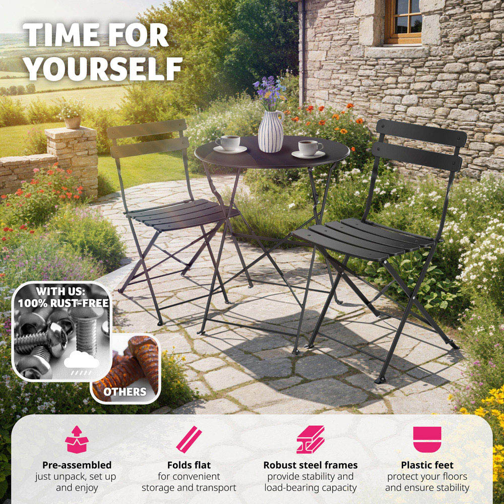 This garden furniture set boasts a space-saving folding function, allowing for easy storage and transportation when not in use. No assembly is required, so the set is ready to use straight away, offering maximum convenience. The robust frames, crafted from powder-coated steel, provide exceptional resilience and stability, further enhanced by floor-protecting and slip-resistant feet.