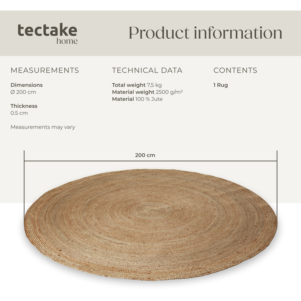 Introduce warmth and texture to your home with the tectake Glim Jute Round Rug, sized at 200 x 200 x 0.5cm. This handwoven rug boasts a unique boho style, transforming any living space into an inviting haven. Each rug is individually crafted, ensuring a one-of-a-kind piece for your home. Made from 100% natural jute fibres, this rug combines sustainability with exceptional durability. Jute is celebrated for its resilience and ability to maintain its shape, even under heavy use. These flat-woven jute rugs are easy to maintain, making them a great choice for allergy sufferers as they prevent dust and pet hair from becoming trapped. Cleaning is simple with a vacuum cleaner, and a damp cloth will take care of any stains. Ideal for living rooms, bedrooms, or dining areas, this rug offers a modern yet timeless appeal, effortlessly complementing both classic and contemporary interiors. Whether used as a cosy centrepiece in the living room, for added comfort in the bedroom, or as a stylish welcome in the hallway, the handwoven Glim rug by tectake will enhance any room in an instant.