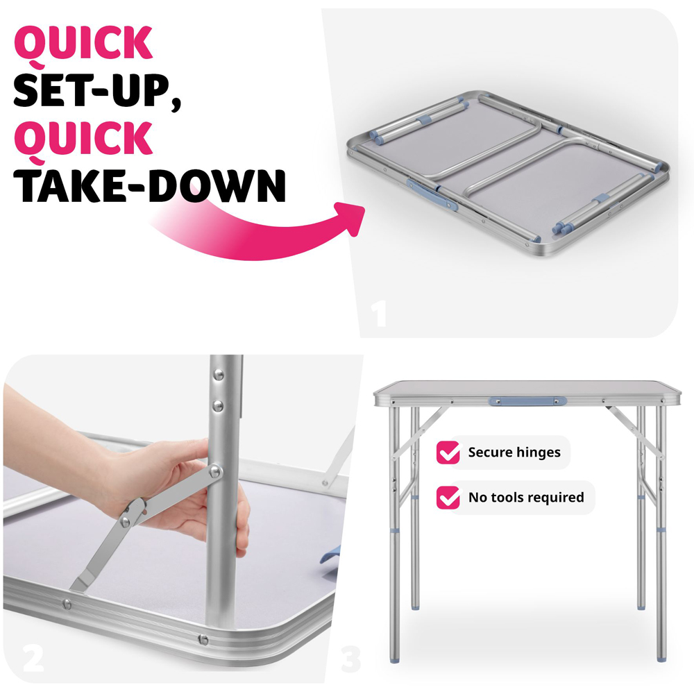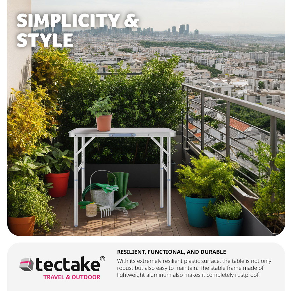 This lightweight and compact camping table is an ideal addition to any outdoor setting. Whether you're at the campsite, enjoying a picnic in the garden, or relaxing on your balcony, this folding table is perfectly suited. Designed for easy transport and storage, it collapses quickly and effortlessly. The moisture-resistant plastic worktop ensures durability against the elements, making it ideal for outdoor use. Plus, adjustable feet allow you to stabilise the table on uneven ground, ensuring a level surface wherever you are.