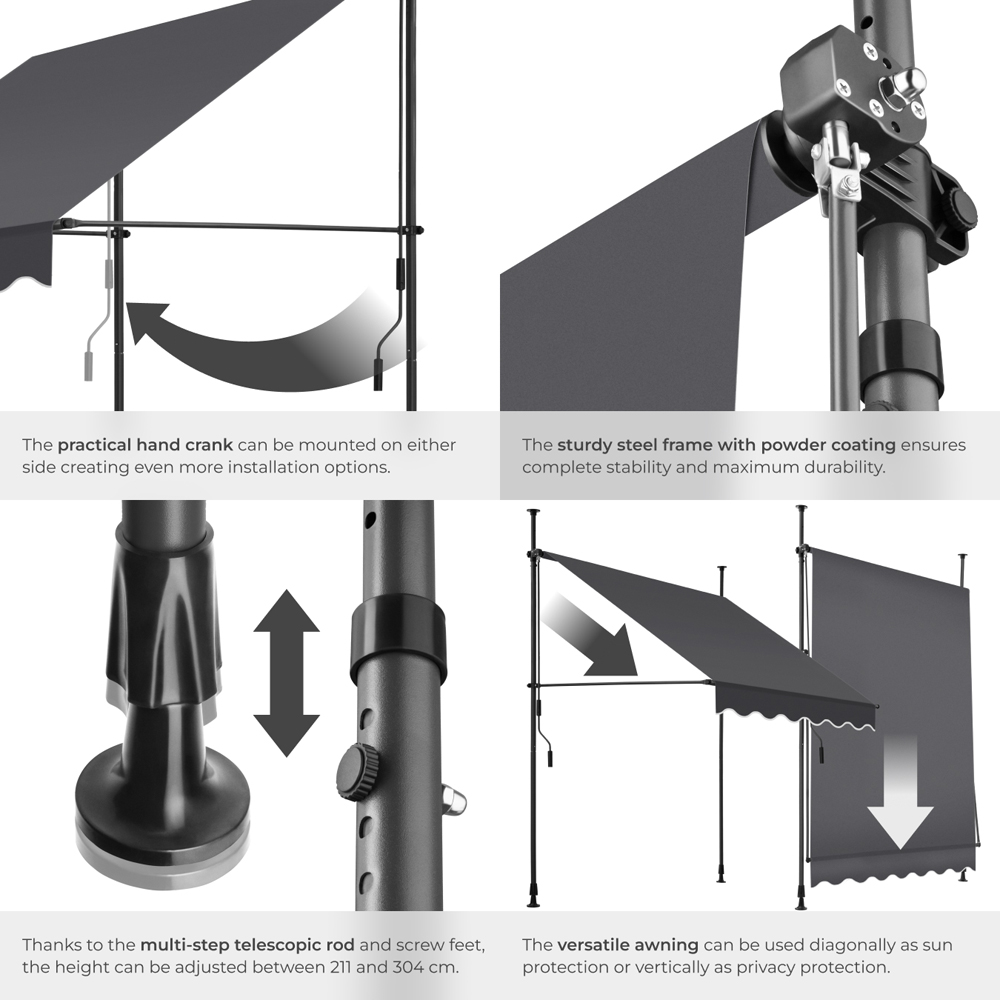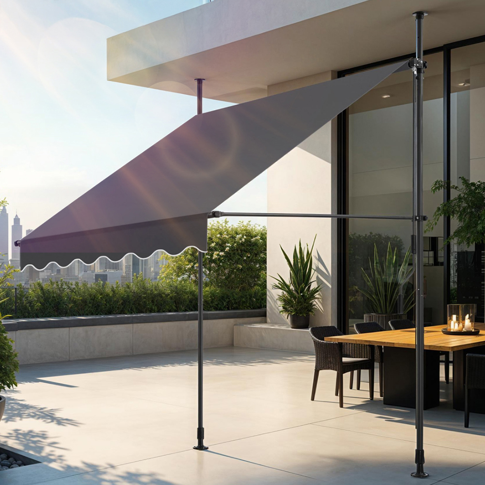 Make the most of your patio, garden, or outdoor space, whatever the weather, with this manual awning, offering protection from both sun and rain. Built to last from powder-coated steel, aluminium, and polyester fabric, its key features include a smooth-running hand crank, UV resistance and rain resistance. Installation is simple, using a clamp system that requires no drilling into exterior walls, setting it apart from other awnings and similar products. Enjoy the flexibility of a retractable patio canopy, allowing you to effortlessly switch between sun and shade. Perfect for use above a patio door, window, or as a roof extension, this retractable awning brings both style and practicality to your outdoor area. Easily adjustable to create the ideal amount of shade, this awning is the perfect way to enhance your outdoor living space. Shop now for a versatile awning that brings comfort and protection.