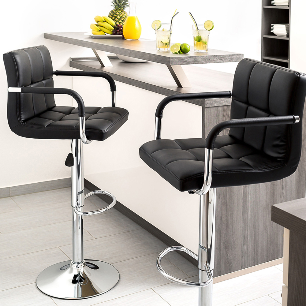 Enhance your home with these designer bar stools from tectake, offering both visual appeal and a comfortable seating experience for dining or relaxation. These stools feature covered armrests for enhanced comfort, a 360-degree swivel, and seamless height adjustability. The base includes a floor-protecting, anti-slip synthetic ring, while the chrome-plated steel frame ensures stability. Finished with an easy-to-clean synthetic leather cover, these bar stools will make a statement in any kitchen, bar, or living room. Elevate your home's style with these beautiful bar stools from tectake.