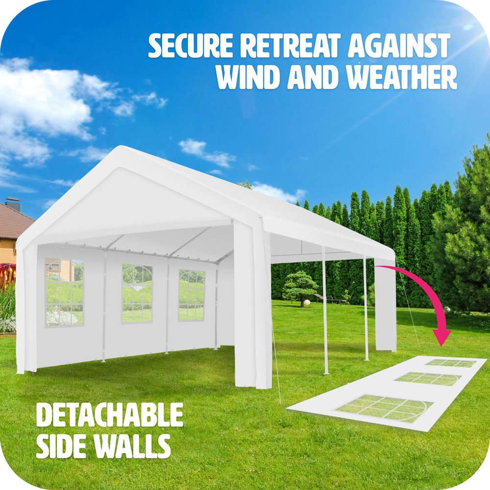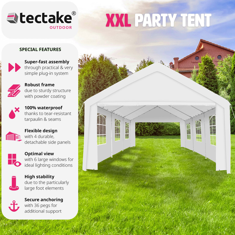 The tectake Jasko 6 x 4m White Side Panel Plug In Gazebo combines practicality with an appealing design. Its robust frame is crafted from fully zinc-plated and powder-coated steel, ensuring durability. Ground pegs and guy ropes are included to securely anchor the pavilion to the ground. The sides are easily removable, offering customisable openness, perfect for any gathering. The roof, constructed from a single piece of durable Polyethylene with taped seams, mirrors the sides in its waterproof design, providing reliable protection against the elements of the British summer. Furthermore, the marquee benefits from UV resistance, offering a welcome shield from both sun and rain. Its generous size makes it ideal for weddings, garden parties, and a variety of other events. Ensure your event is a success with this versatile marquee.