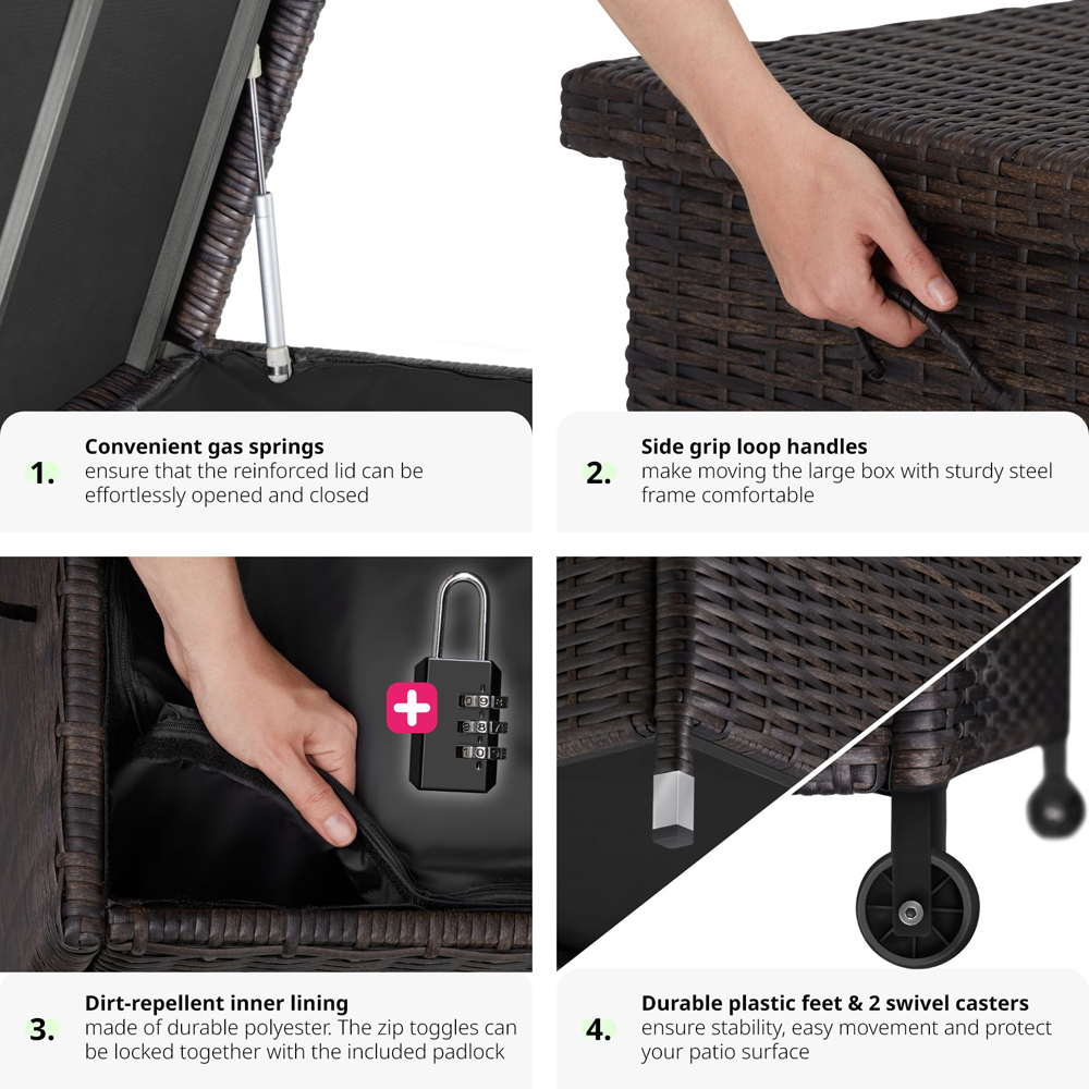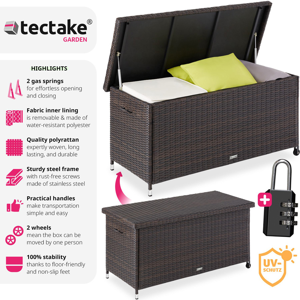 Enhance your outdoor area with tectake's Kiruna garden storage box, providing ample storage in a stylish design. The sturdy steel frame is encased in natural-looking, hard-wearing plastic poly rattan that seamlessly integrates into any garden setting. A reinforced, lockable inner pocket keeps contents safe from dust, dirt, and moisture, and can be further secured with the included combination lock for extra security. Move the compact construction around with ease thanks to its two handles and two castors. Perfect for stowing cushions, tools, and other household items, the Kiruna storage box is a versatile and practical addition to your garden. Dimensions: 120 x 55 x 61.5cm.