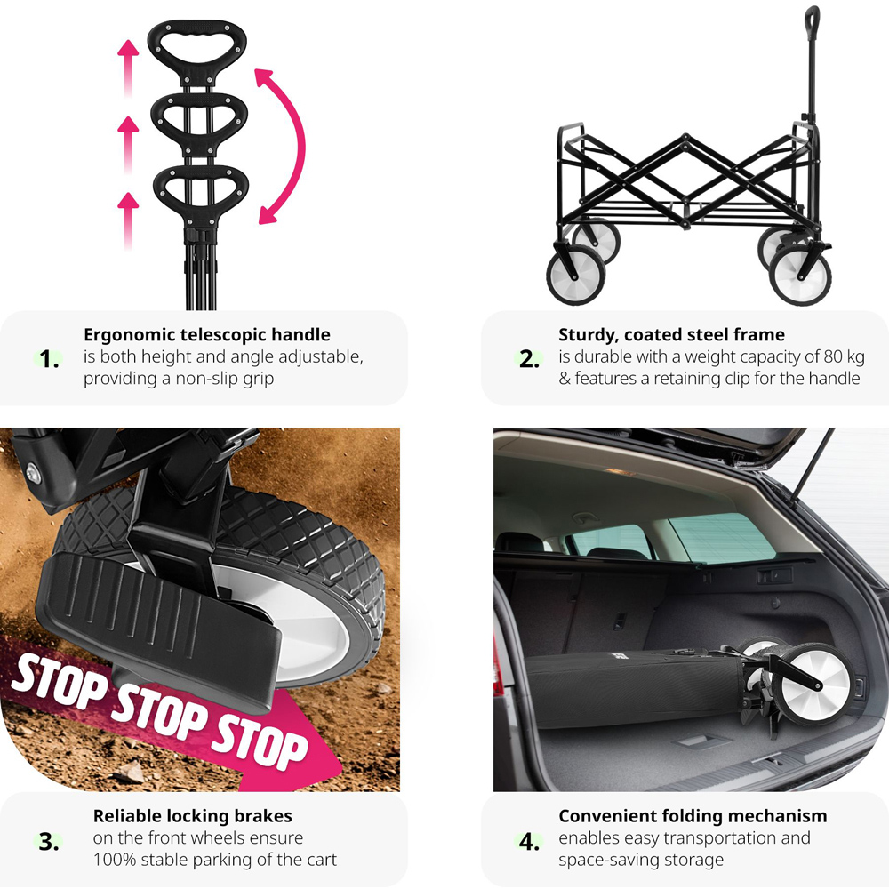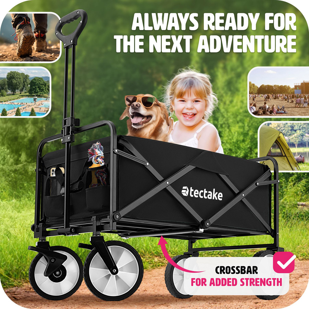 The tectake Leon foldable garden trolley in black is the ideal assistant for all your gardening and outdoor needs. Featuring a foldable frame, a removable insert, and handy mesh pockets, this versatile cart is perfect for keeping your lawn equipment, tools, and accessories organised and easily accessible. Constructed from robust steel and hard-wearing Oxford fabric, it offers an impressive 80 kg capacity, making light work of transporting heavier items such as petrol mowers or electric trimmers. A telescopic handle allows for easy pulling, the front wheels offer a tight turning circle, and parking brakes prevent unwanted movement, making it a great choice for shopping trips and local errands, whatever the size of your home.