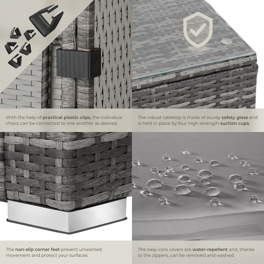 The modular design allows for various configurations to suit your space and needs, while convenient connexion clips enable quick and easy securement of the pieces within minutes. The side table features a removable safety glass top, offering extra functionality as a footrest or additional seating option.