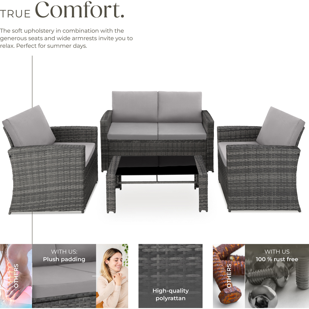 Create your own tranquil haven with the Lucca four-seater outdoor sofa set. Perfect for relaxing conversations and escaping the everyday, this stylish garden furniture set comfortably seats four. The set includes rattan dining chairs and a table, blending practicality and sophisticated design to enhance your patio, terrace, or garden. The sturdy table features a removable glass top, cleverly combining a compact footprint with a generous surface area, measuring approximately 89 x 50 x 36.5cm – ideal for drinks, snacks, and all your outdoor essentials.