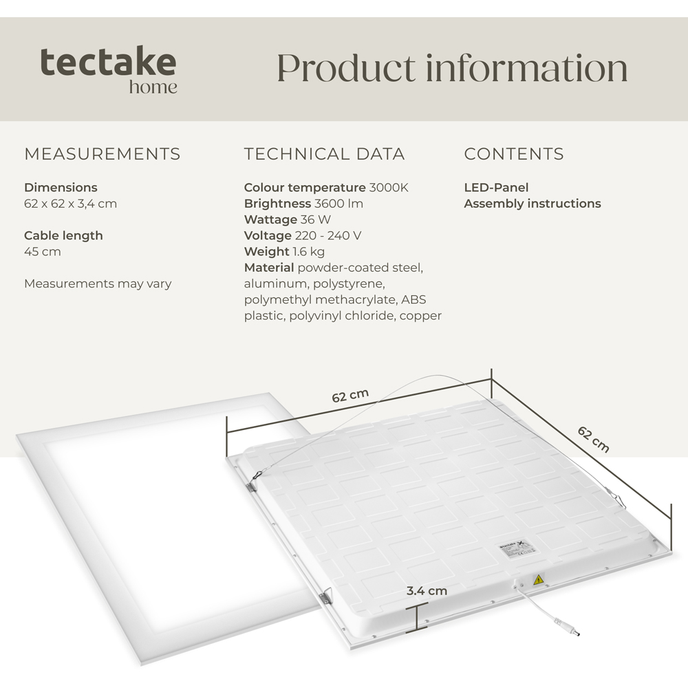 tectake Lucerna 36W 3000K Ultra Slim Warm White LED Panel Light 62 x 62cm