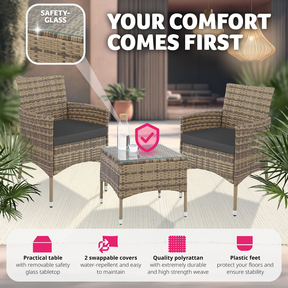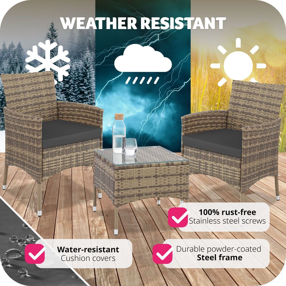 Perfect for outdoor dining and relaxation, this rattan garden furniture set features UV-resistant material, ensuring the furniture retains its beauty even after prolonged exposure to sunlight. Additionally, the sturdy plastic caps on the feet of the chairs and table prevent unwanted movement and protect flooring from scratches.