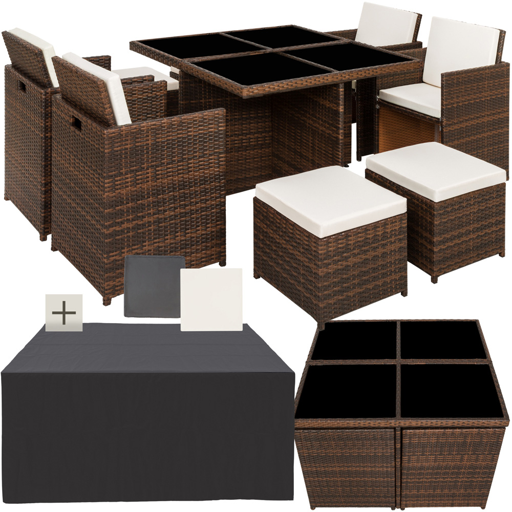 Transform your outdoor area into a stylish haven with the New York garden furniture set from Tectake. This elegant outdoor set features a large dining table, four comfortable chairs and four stools, complete with thick cushions and a rain cover. Perfect for both relaxation and entertaining meals with friends and family, this set brings function and fashion to your garden.