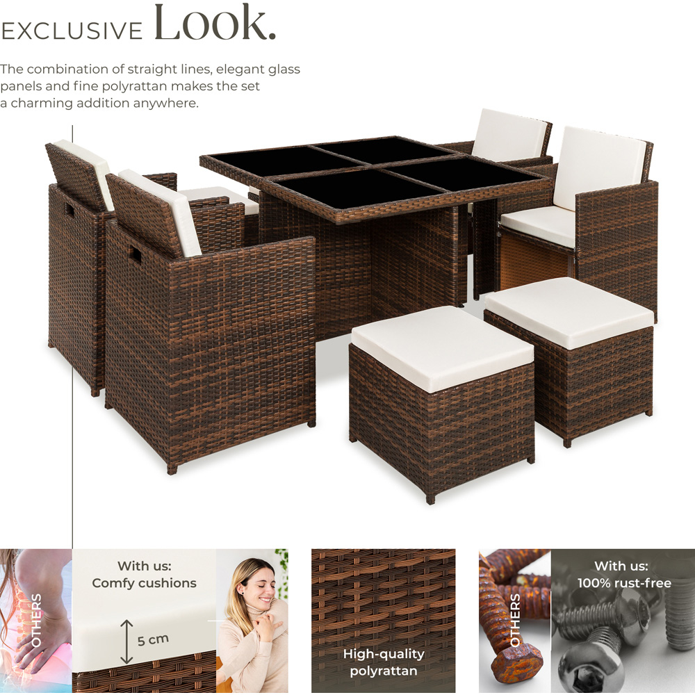 The durable and stylish rattan construction is complemented by sophisticated grey or beige cushion covers, making maintenance simple and convenient. Whether you're lounging or dining, the rattan-look dining table and outdoor furniture pieces offer excellent comfort.