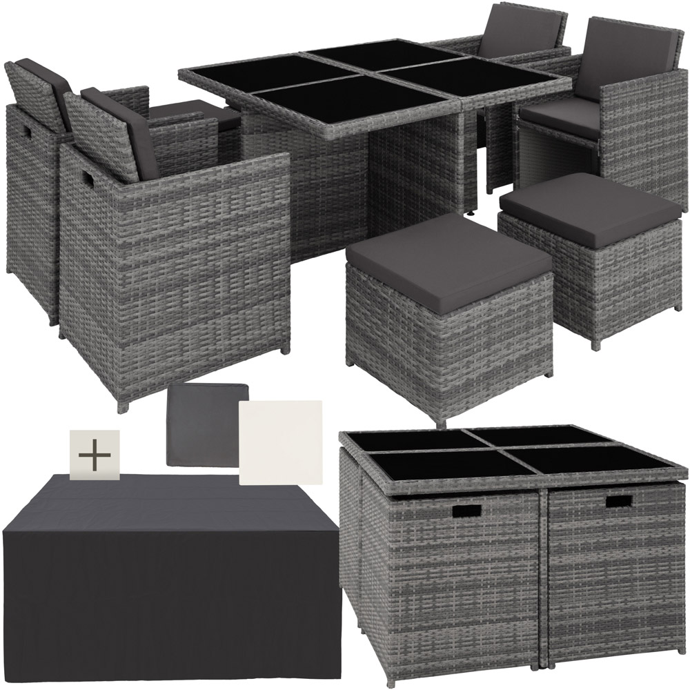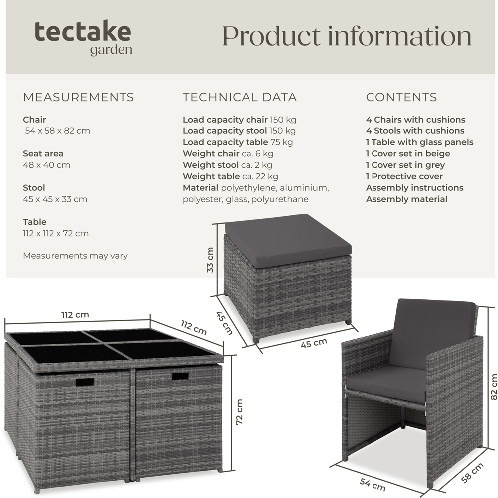 Transform your outdoor space into a haven of relaxation with the New York garden furniture set from tectake. This elegant set, perfect for patios, balconies, or gardens, includes a generous dining table, four comfortable chairs, and four stools. Enjoy leisurely meals or host gatherings with friends and family, all while seated on thick, comfortable cushions.