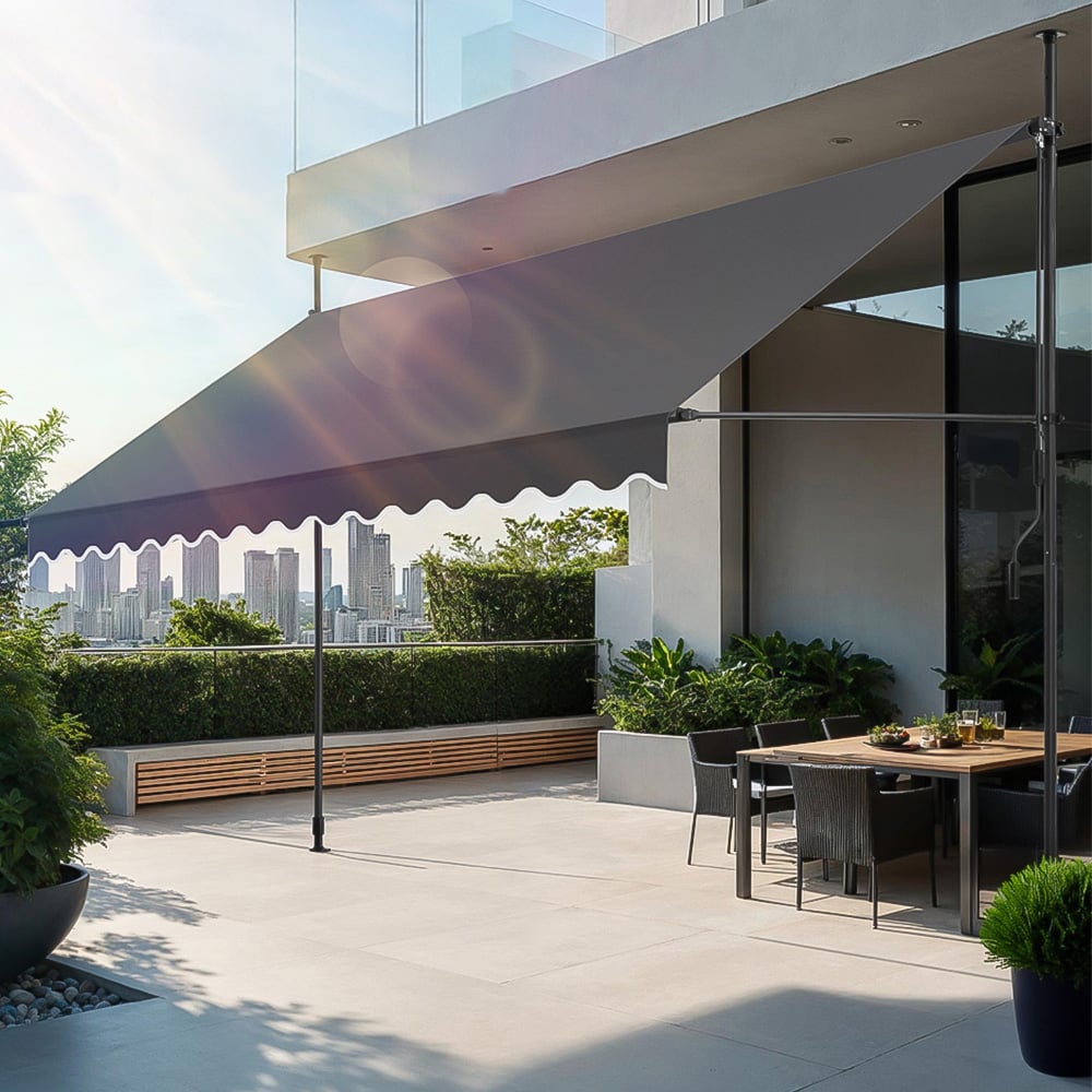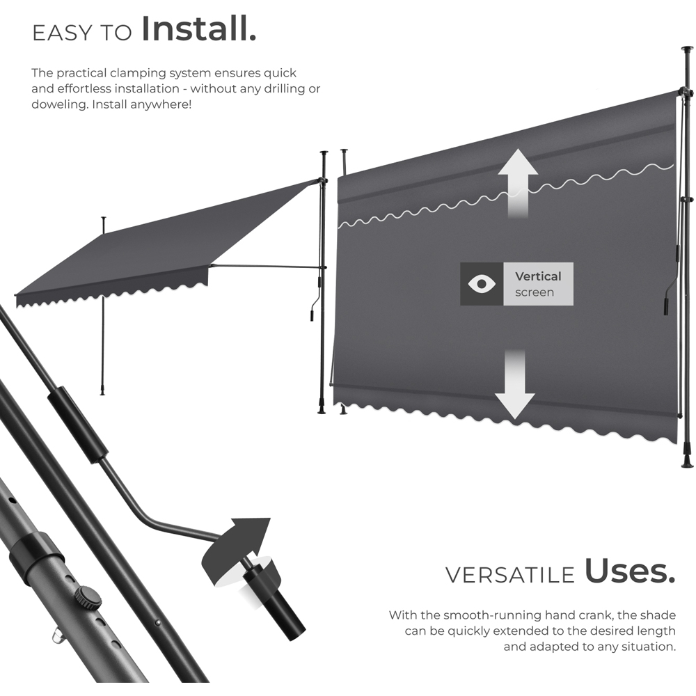 Make the most of your patio or garden, whatever the weather, with this manual awning providing shelter from both sun and rain. Crafted from durable powder-coated steel, aluminium, and polyester fabric, this awning is designed for longevity. A smooth-running hand crank makes extension and retraction simple. Unlike many awnings, installation is straightforward thanks to a clamp system, eliminating the need for drilling into your walls. Enjoy the flexibility of a retractable canopy, allowing you to effortlessly switch between sun and shade. Ideal for use above a patio door, window, or as a roof extension, this easy-to-install awning offers excellent UV and rain protection. Adjustable to provide the perfect amount of shade, it brings both style and practicality to your outdoor area. A versatile addition, bringing comfort and protection to your home.