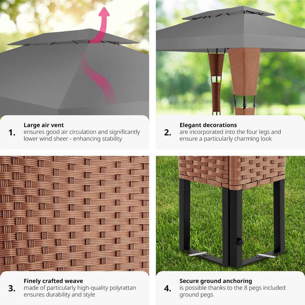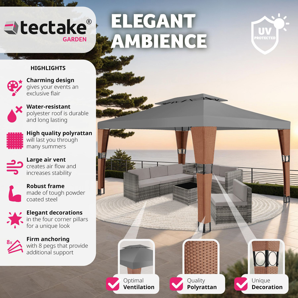 Transform your garden into a relaxing retreat with this tectake Mona 4 x 3m rattan gazebo, featuring a sophisticated brown and anthracite colour scheme and double roof design. Perfect for enjoying hot days, warm summer evenings, and garden parties, the water-resistant roof provides ample shade. A raised roof panel promotes fresh air circulation. Constructed with a powder-coated steel frame, elegantly finished with poly rattan and ornamental details. Ideal for patios and outdoor dining areas, this gazebo adds a touch of holiday charm to your garden.