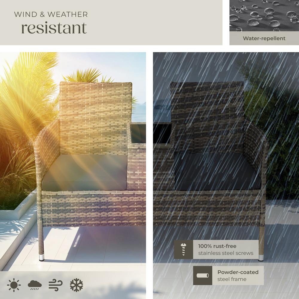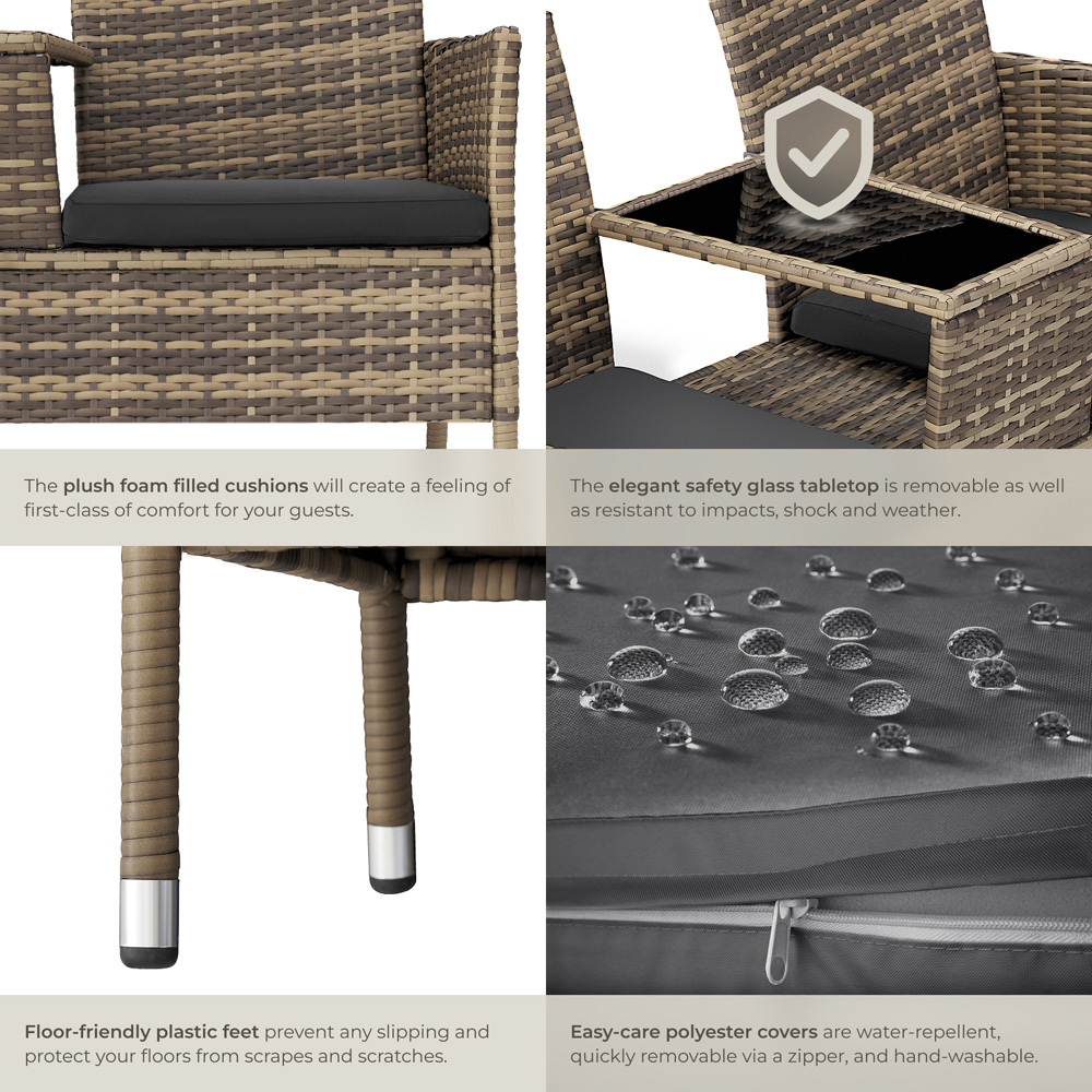 This tectake Narbonne bench offers the perfect spot to unwind outdoors with a loved one. Envision relaxing moments in your garden, on the patio, balcony, or even in your conservatory, all made more comfortable with the included seat cushion. Crafted from durable polyrattan, this two-seater bench blends seamlessly into any outdoor setting. The seat covers are easily removable and washable, ensuring fuss-free maintenance. But there's more – a cleverly integrated central table sits between the seats, complete with a stylish glass top, ideal for holding drinks, books, or sun cream. Transform your garden bench into a romantic outdoor dining experience for two. Stylish, practical and built to last, this two-seater bench in a nature and dark grey finish is an ideal addition to your outdoor space.