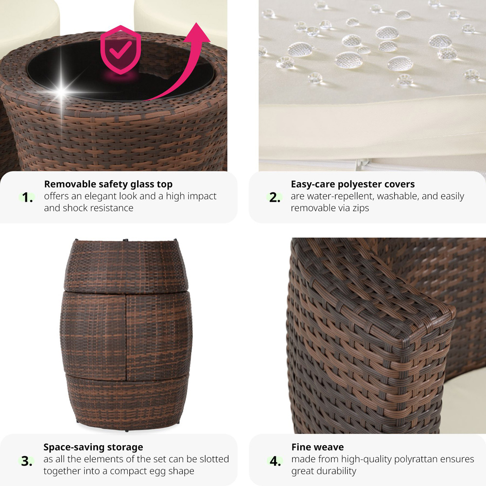 Bring a touch of summer comfort to your outdoor space with this four-piece rattan seating set from tectake. Thick, plush cushions redefine relaxation, while the durable polyrattan weave and rust-resistant aluminium frame ensure lasting quality. The clever design allows the chairs to be stored together in an oval shape when not in use. Small in size but big on style, this modern rattan seating set from tectake makes a stylish statement.