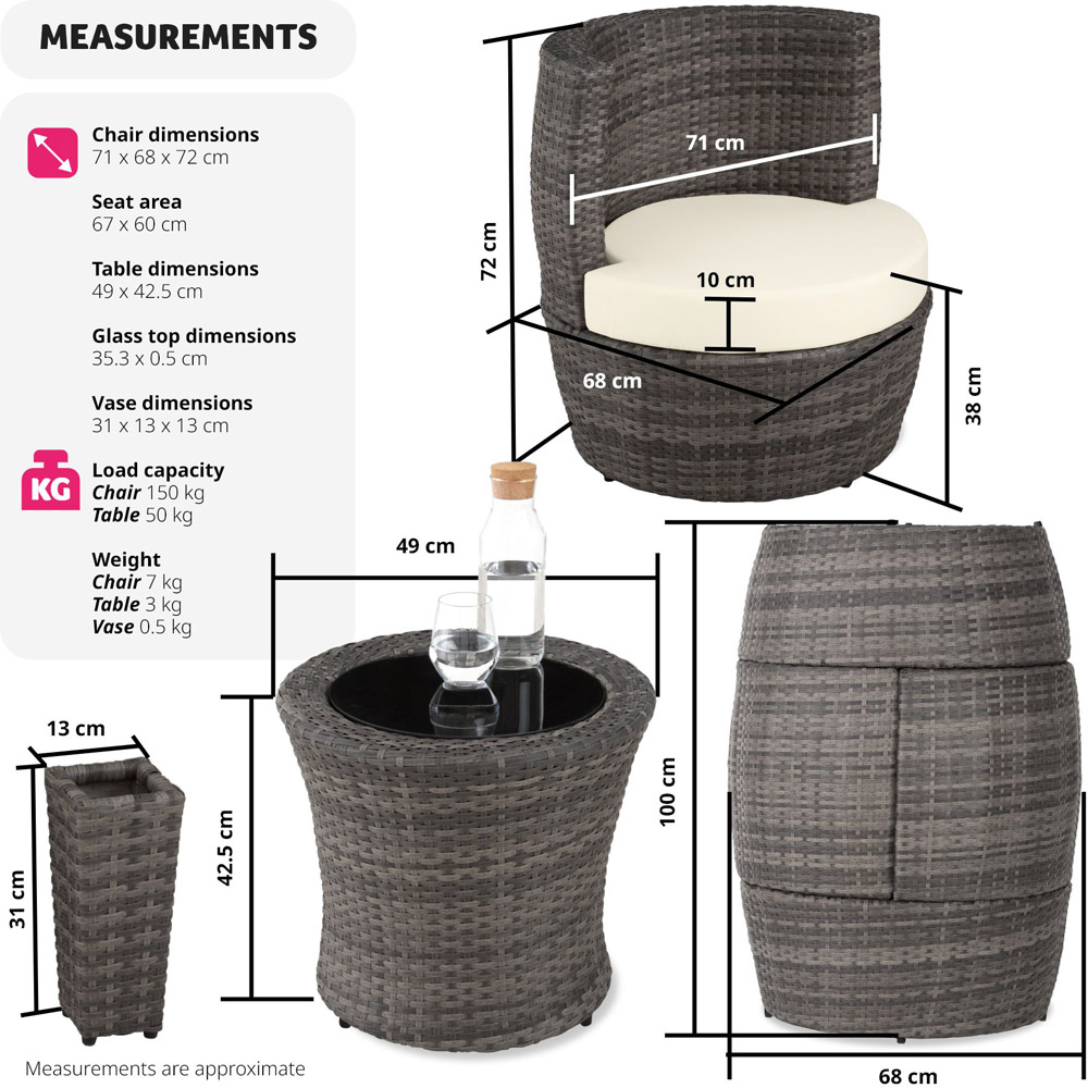 Sink into summer with this fabulous four-piece rattan seating set from tectake, where breezy style meets ultimate comfort. The sumptuously thick cushions redefine relaxation, whilst the durable polyrattan weave and sturdy, rust-resistant aluminium frame ensure this set is perfect for outdoor use. When the sun dips, the pieces nest neatly together in an oval shape. Small in size, but big on impact: this modern tectake rattan set brings effortless style to any space.