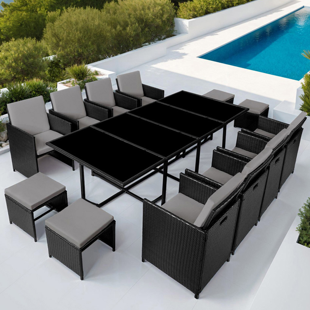 At its heart lies a substantial table featuring four easy-clean safety glass panels. These panels create a large, sleek surface ideal for both grand feasts and casual meals. The glossy black finish adds a touch of modern elegance, making it a stunning focal point for your patio or garden. The woven Polyrattan pattern is both visually appealing and highly weather-resistant, ensuring your furniture remains in excellent condition for years to come. Invest in the Palma and transform your outdoor space into a stylish and relaxing retreat.