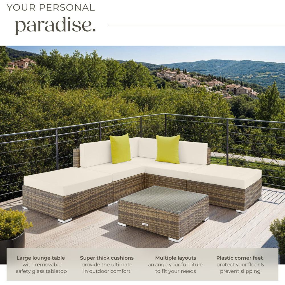 The comfortable polyester seat cushions are perfectly colour-coordinated with the rattan and feature a zip for easy cleaning. To protect the padding, the surface is impregnated, allowing water droplets and dirt to simply roll off. Arrange the individual elements to your liking and needs. This outdoor furniture set includes two additional cushions, further enhancing its charm. Transform your patio or garden into an open-air living room with this great rattan garden furniture set from tectake.