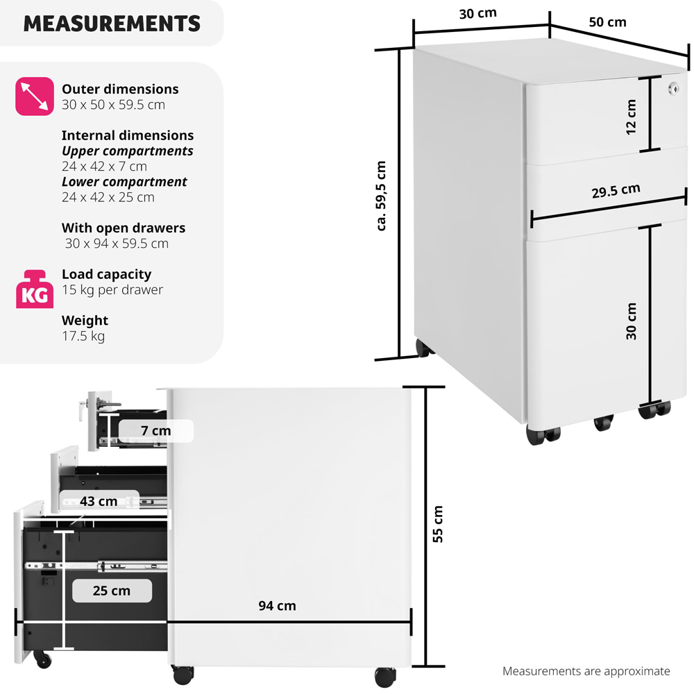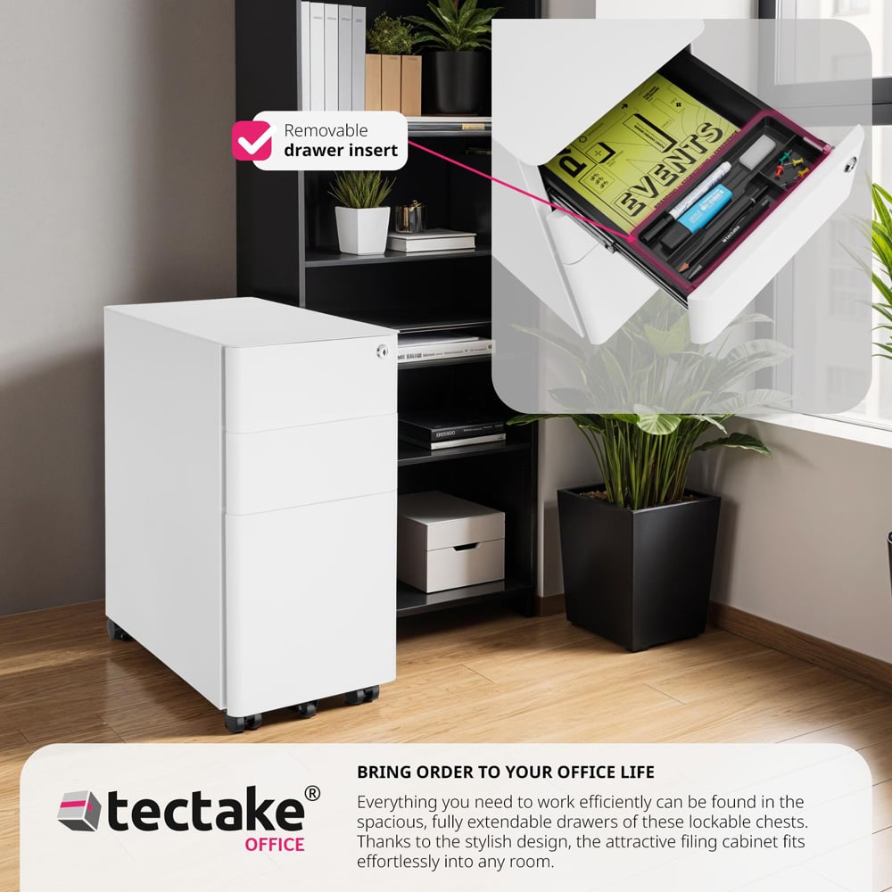 Enhance your office or home workspace with the tectake Parvus White 3-drawer Powdered Steel Filing Cabinet. This attractive mobile storage unit conveniently fits beneath any desk, transforming clutter into an organised space that boosts productivity. It accommodates documents in standard DIN-A4 size and includes a functional hanging file system. There is also a detachable insert for writing tools, ensuring that pens and other items are neatly stored. The cabinet features fully extendable drawers designed for quick access, and it includes a central cylinder lock with two keys to keep your confidential documents secure. Its fully rotating casters, two of which are lockable, allow for versatile use throughout the workplace—making it ideal for dynamic work environments. Constructed from powder-coated steel, this desk filing cabinet is extremely sturdy, making it suitable for any home, office, or retail setting. To provide additional stability, a useful wheel is attached to the bottom drawer. The sleek, pre-assembled design features smooth surfaces and rounded edges, enabling the unit to blend seamlessly into any room decor and enhancing the professionalism of your office. With multiple drawers, this resilient metal cabinet is perfect for organising important files in an orderly manner.