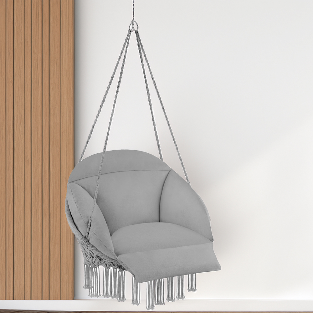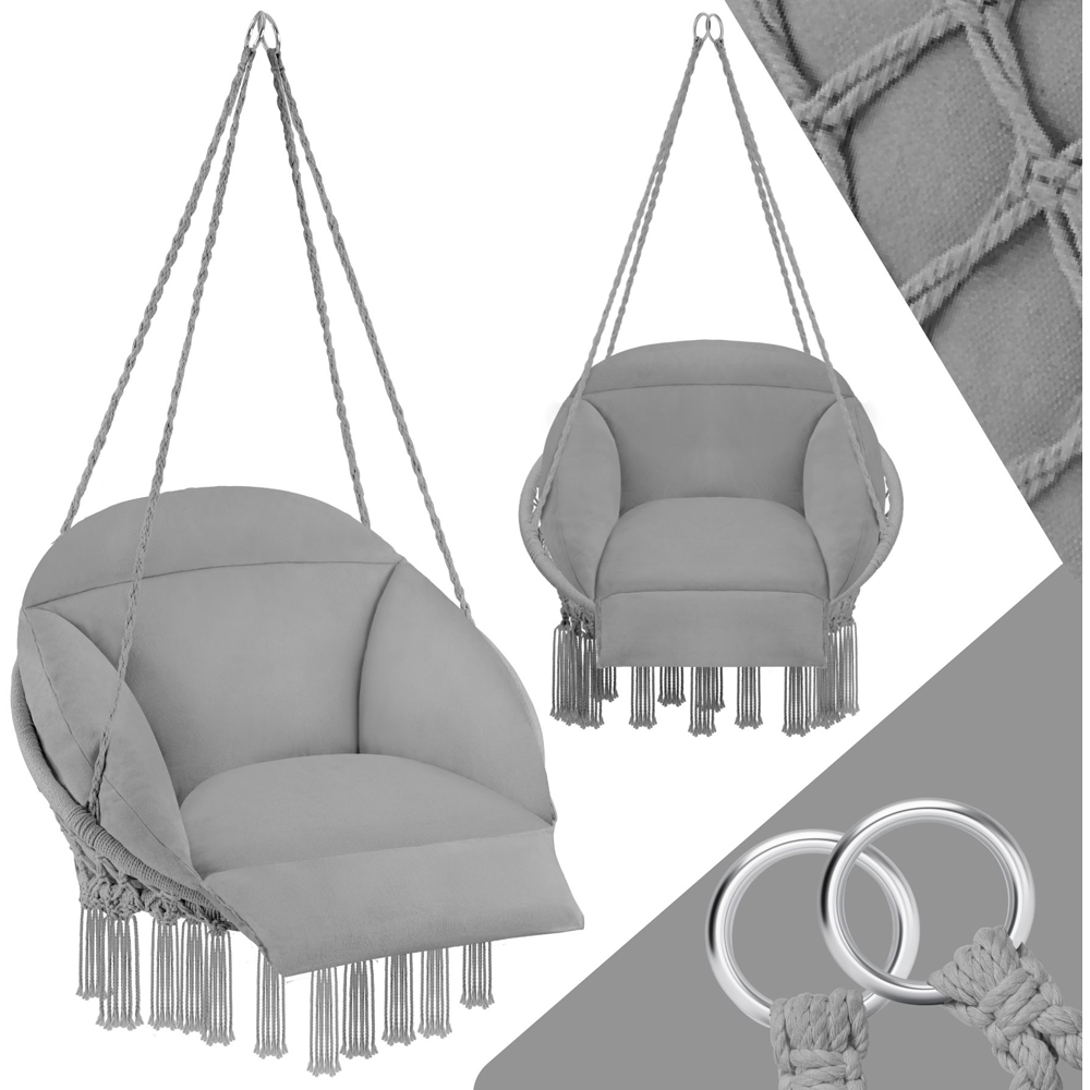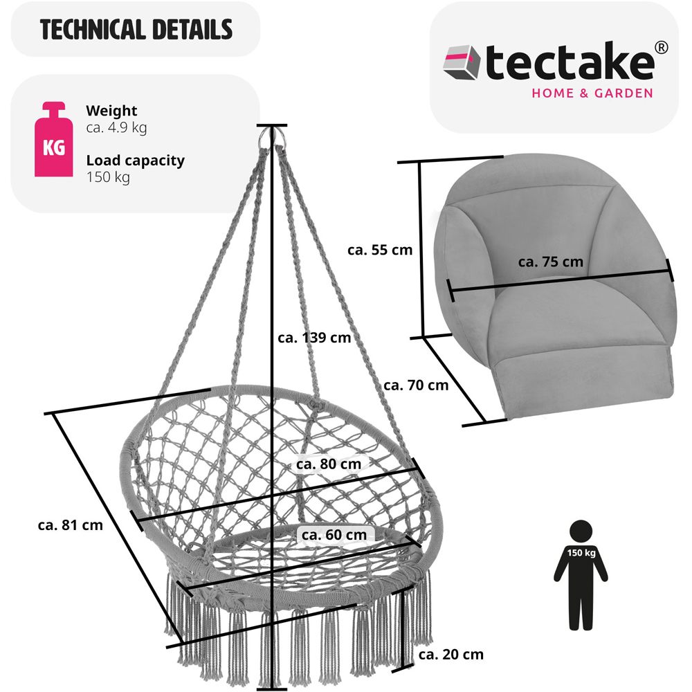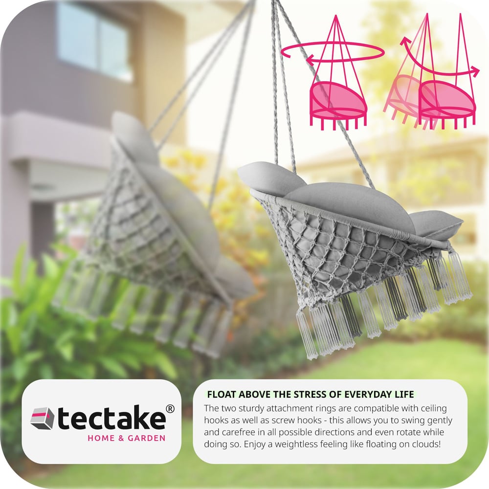 Transform any space into a haven of relaxation with the tectake Samira Grey Swing Chair. Sink into the embrace of its generously sized, soft pillow, offering perfect support for your arms, back, and legs as you unwind. Crafted with four robust rope tethers on a foldable frame of woven fabric and powder-coated steel, this chair ensures secure and delightful floating whether indoors or out. A charming touch are the decorative tassels adorning the underside, lending a playful, romantic flair to this basket chair swing. Suitable for both indoor and outdoor use, create your own cosy retreat with the free-swinging Samira hanging chair from tectake.