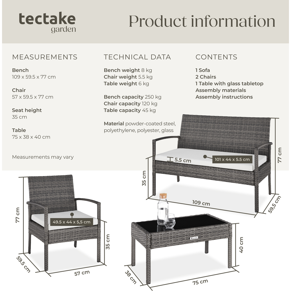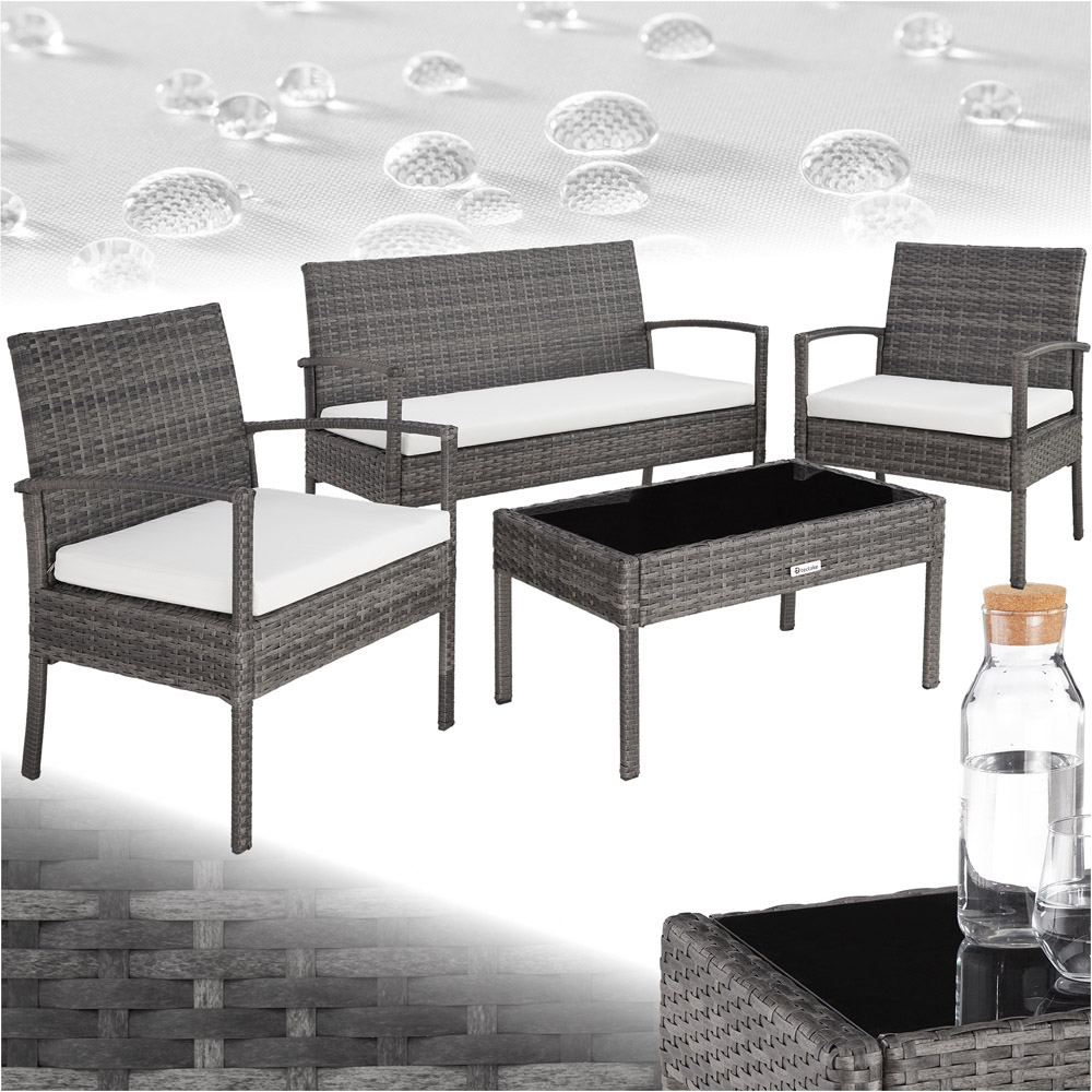 The beautiful Sparta rattan set by tectake is ideal for any outdoor social event. This four-seater outdoor furniture set features two chairs, a sofa, and a small table with an easy-to-clean glass top, perfect for outdoor dining and relaxing. Crafted from durable, weather-resistant poly rattan, this set is specifically designed for garden furniture thanks to its high durability and sturdy frame, along with water-repellent cushion covers. Poly rattan, a synthetic woven material made from polyethylene, offers a more durable, weather-resistant, and lighter alternative to natural rattan. The seat cushions, approximately 5.5cm thick, are visually coordinated with the furniture’s elegant dark design and ensure great sitting comfort. Made from water-repellent PU materials, they are easy to clean with little effort. Add the tectake Sparta rattan set to your garden, patio, or balcony and ensure outdoor comfort all summer long.