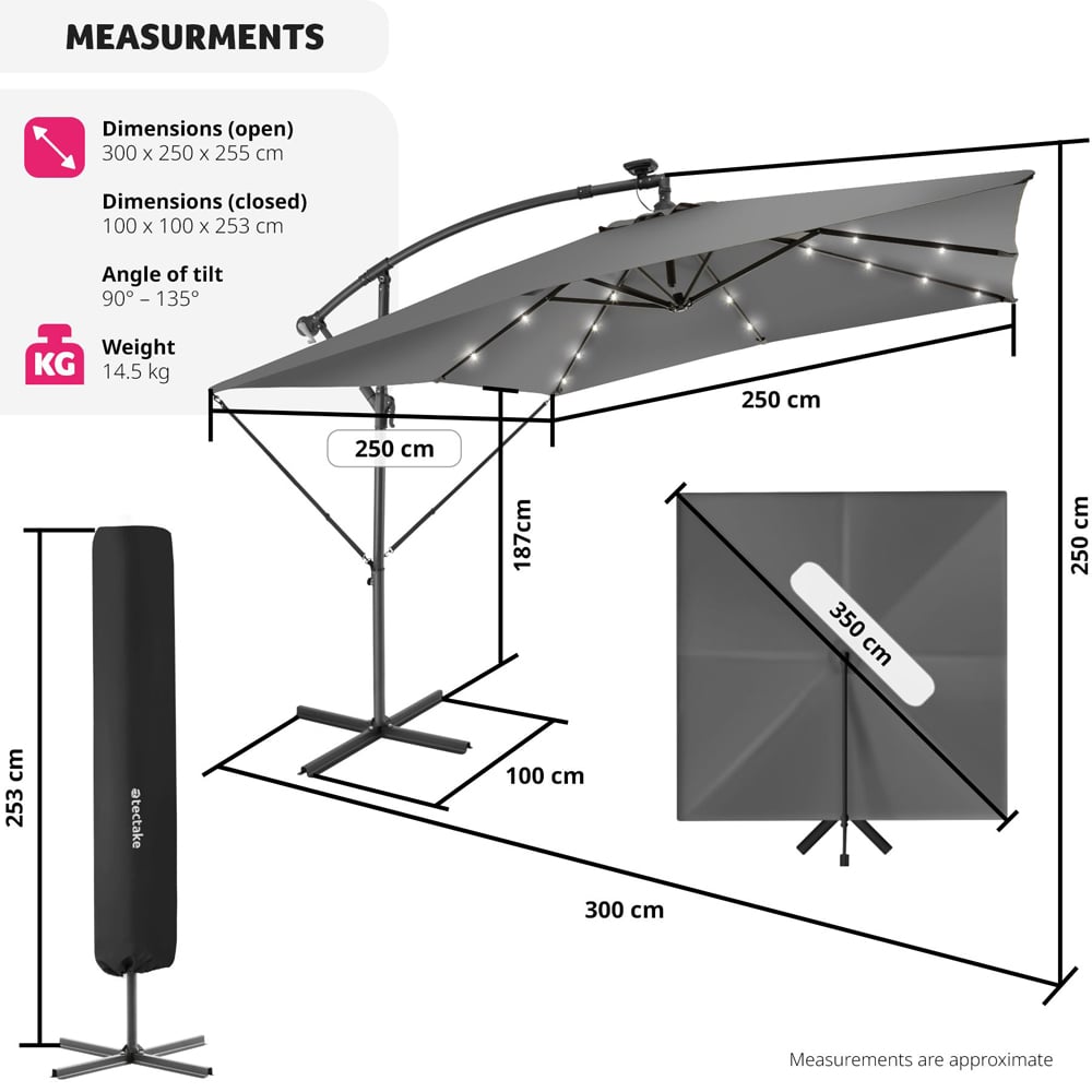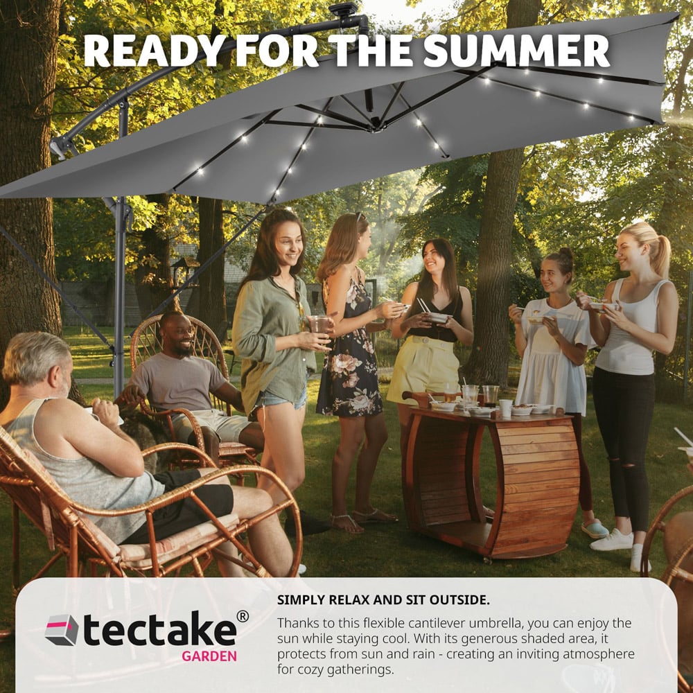 Elegantly craft a cool refuge from the sun's glare with the tectake Sunna Light Grey Solar LED Lighting Parasol, sized at 2.5 x 2.5m. Its smooth crank mechanism makes opening and closing effortless, while the handy locking lever allows for seamless adjustment of the tilt angle. Designed for superb stability, this cantilever parasol boasts a central air vent and secure wind protection straps, ensuring lasting durability and water repellence. The true magic of this garden parasol lies in its 24 solar-powered LED lights integrated within the struts, conjuring a captivating ambience after dark. With the Sunna parasol from tectake, unforgettable moments are assured.