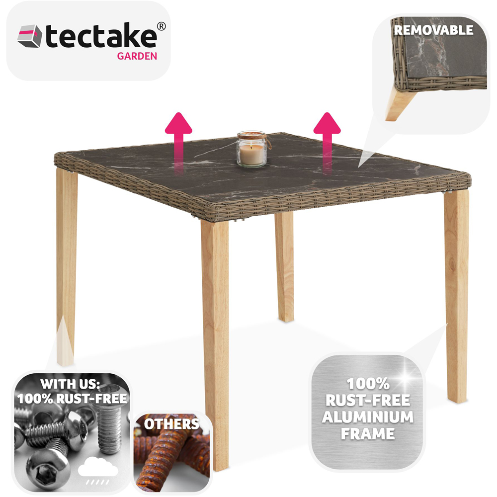 Bring an elegant touch to your outdoor dining area with the Tarent square garden table from tectake. The tabletop features a colour-matched plastic rattan weave, replicating the look of natural wicker while offering enhanced durability and weather resistance. Supported by a robust aluminium frame and solid wooden legs, this table ensures excellent stability and resilience. The legs are finished with plastic caps to protect your patio or kitchen floor. Coordinate this table with chairs and other pieces from our collection to create the perfect setting for your next outdoor gathering. The Tarent garden table: stylish outdoor furniture for your home.