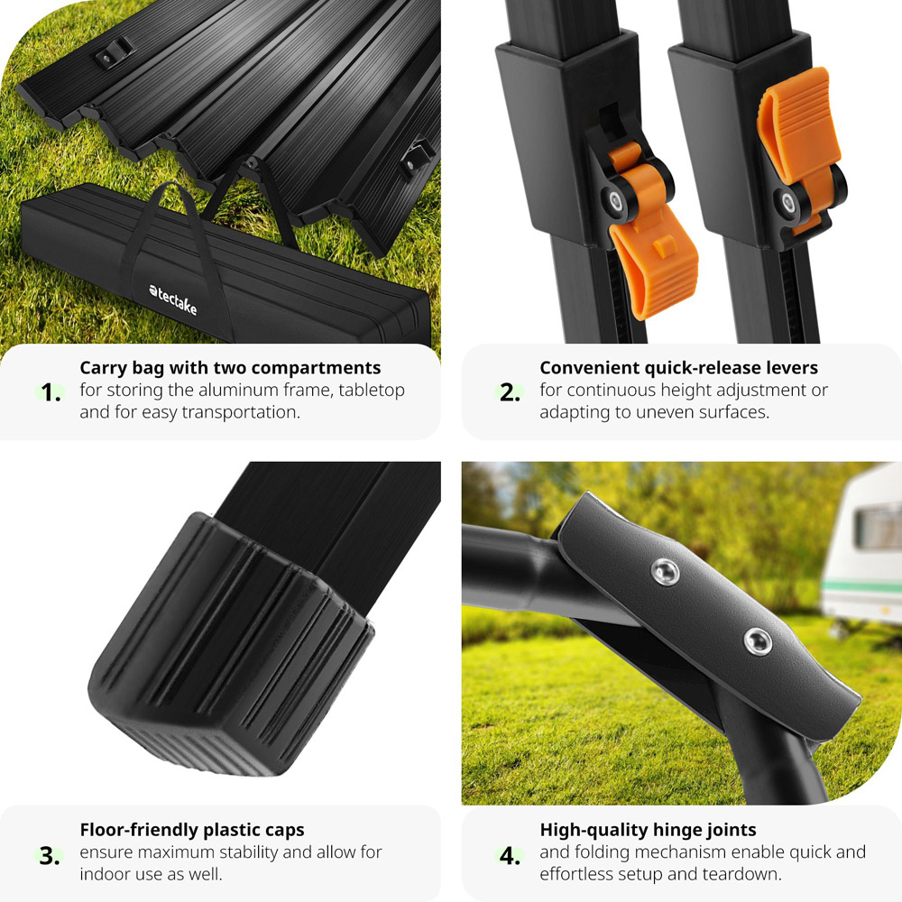A must-have for outdoor adventures, the Tina folding camping table from tectake combines practicality with a sleek design. Whether you're camping, picnicking, or enjoying a festival, this table is a great addition to your camp furniture. Its foldable design, complete with a carry bag, makes it ideal for those who need to save space in a small tent. Made from weather-resistant aluminium, it's perfect for any outdoor environment, alongside tents, sleeping bags, and other camping gear. Thanks to its adjustable legs, it adapts to uneven ground, making it suitable for use with camping chairs. This versatile table enhances your camping experience and is also useful for children's outdoor activities. In addition, the integrated net keeps accessories like clothing and small picnic items within easy reach, and the floor-friendly plastic caps mean it can be used indoors too. A valuable addition to your collection of camping furniture, the Tina table offers both quality and value, making it a smart choice for those seeking practicality without sacrificing style.