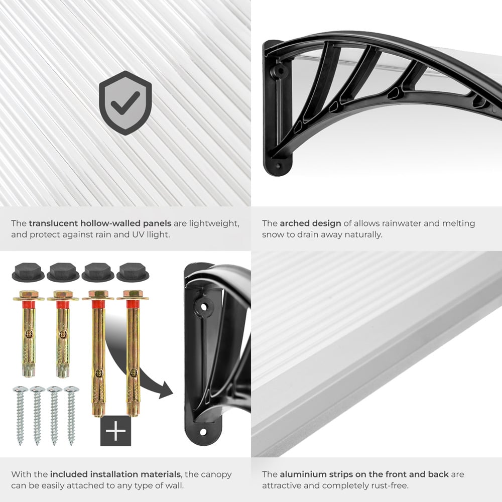 Shield your doorway or windows from the unpredictable weather with the tectake Transparent Canopy. More than just an attractive addition to your home, this shelter provides reliable protection from rain and other elements, thanks to its robust, transparent polycarbonate construction. Designed for impact resistance and shape retention, it will withstand the rigours of any weather. Hard plastic support rods ensure lasting stability, while easy installation means you can quickly enjoy the benefits of this stylish and practical canopy. Ideal for doors, windows, or shop fronts. Size: 120 x 93cm.