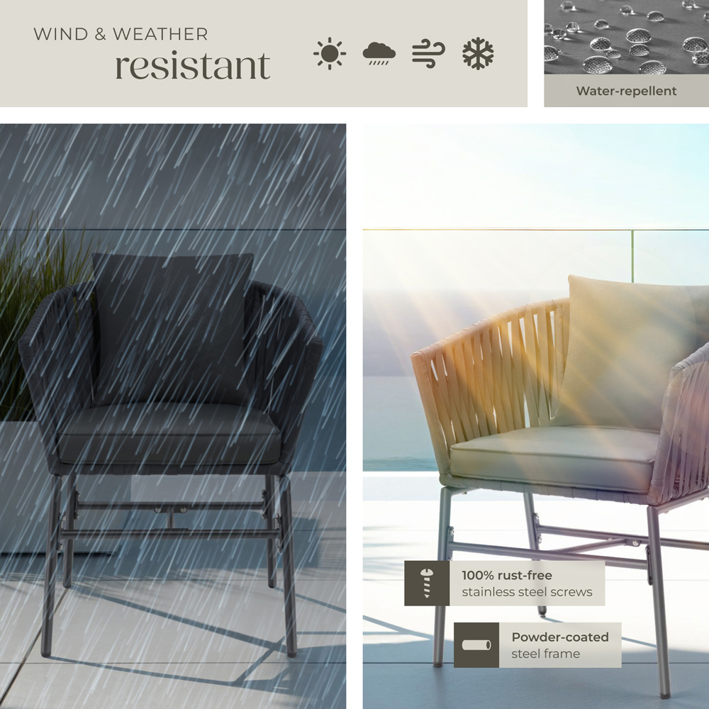 Enhance your outdoor space with the Tectake Valeiras chair set, a stylish addition to any terrace, balcony, or garden. The decorative rope weave detailing on the continuous arm and backrests gives these chairs a unique, eye-catching charm, while the thickly padded seat and back cushions ensure exceptional comfort. The easy-care polyester covers are water-repellent, removable, and washable, offering practicality and style.