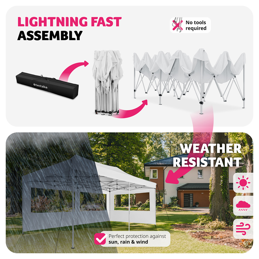 Transform your outdoor area into a haven with this tectake Viola 6 x 3m White 2 Side Panel Gazebo. Crafted for convenience, the easy assembly scissor frame boasts an intuitive click system, allowing for effortless assembly in mere moments. The roof and side panels attach securely to the robust frame with reliable hooks and hook and loop fasteners.