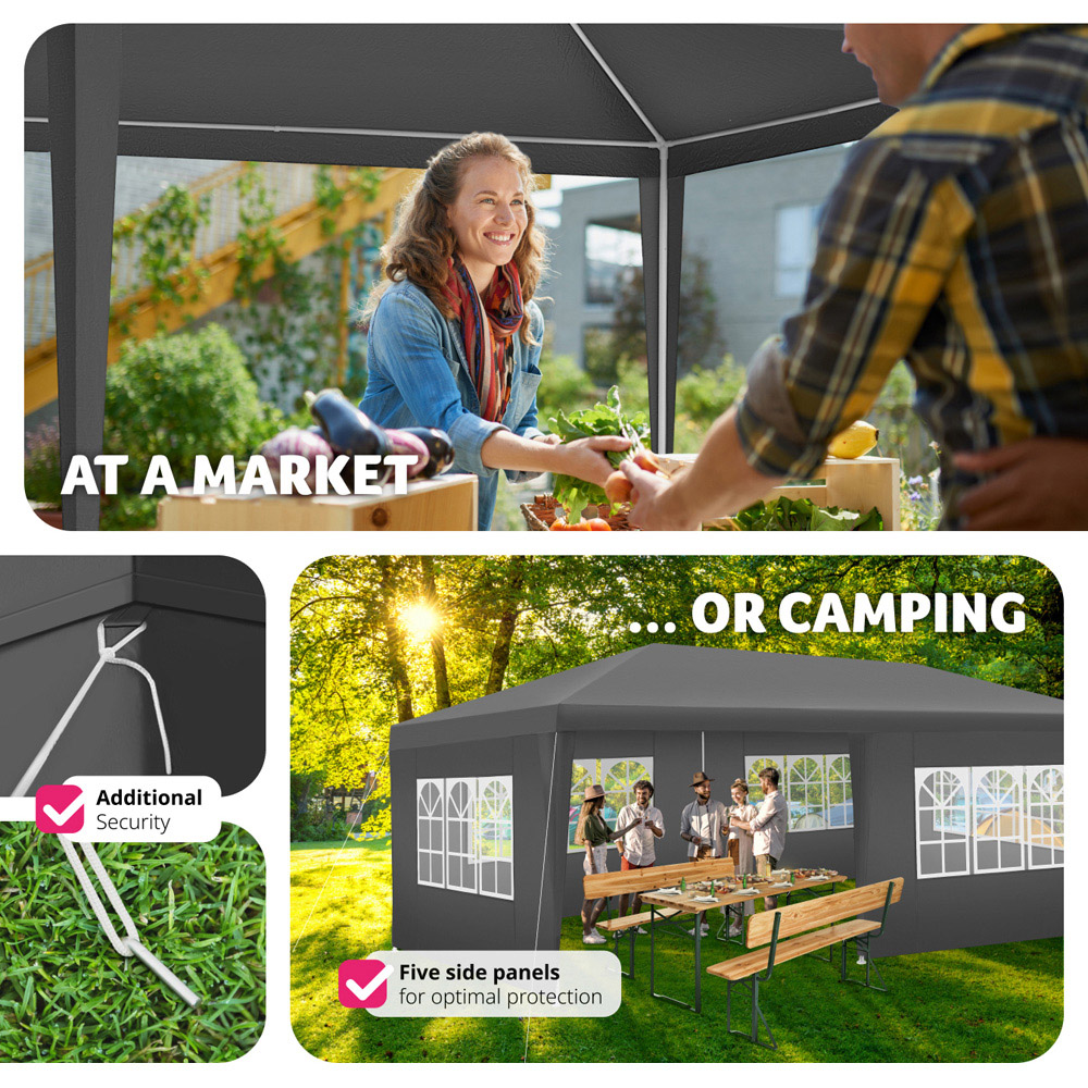 Enjoy the outdoors, come rain or shine, with the Vivara gazebo. This versatile 6m x 3m structure provides ample shade on sunny days and reliable protection from wind and rain. Five detachable side panels, secured with Velcro fasteners, feature generous windows to allow plenty of natural light. The powder-coated steel frame, further stabilised with included guy ropes and pegs, ensures robust outdoor performance. Conveniently dismantles for compact storage after use. Perfect for garden parties and creating a sheltered area for your patio furniture.