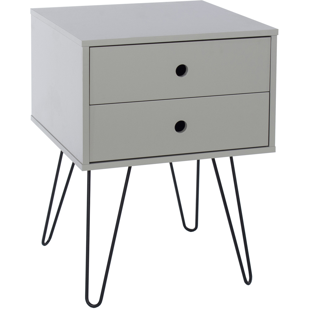 Elevate your bedroom's style and functionality with the Telford bedside cabinet. This industrial-designed piece boasts a light grey matte finish and two drawers, perfect for storing bedtime essentials. The drawers feature convenient cut-out finger apertures for easy access. Standing on sleek black metal hairpin legs, the Telford offers a modern touch with its Scandinavian design influences. Crafted from MDF, this cabinet is a stylish and practical addition to any bedroom.
