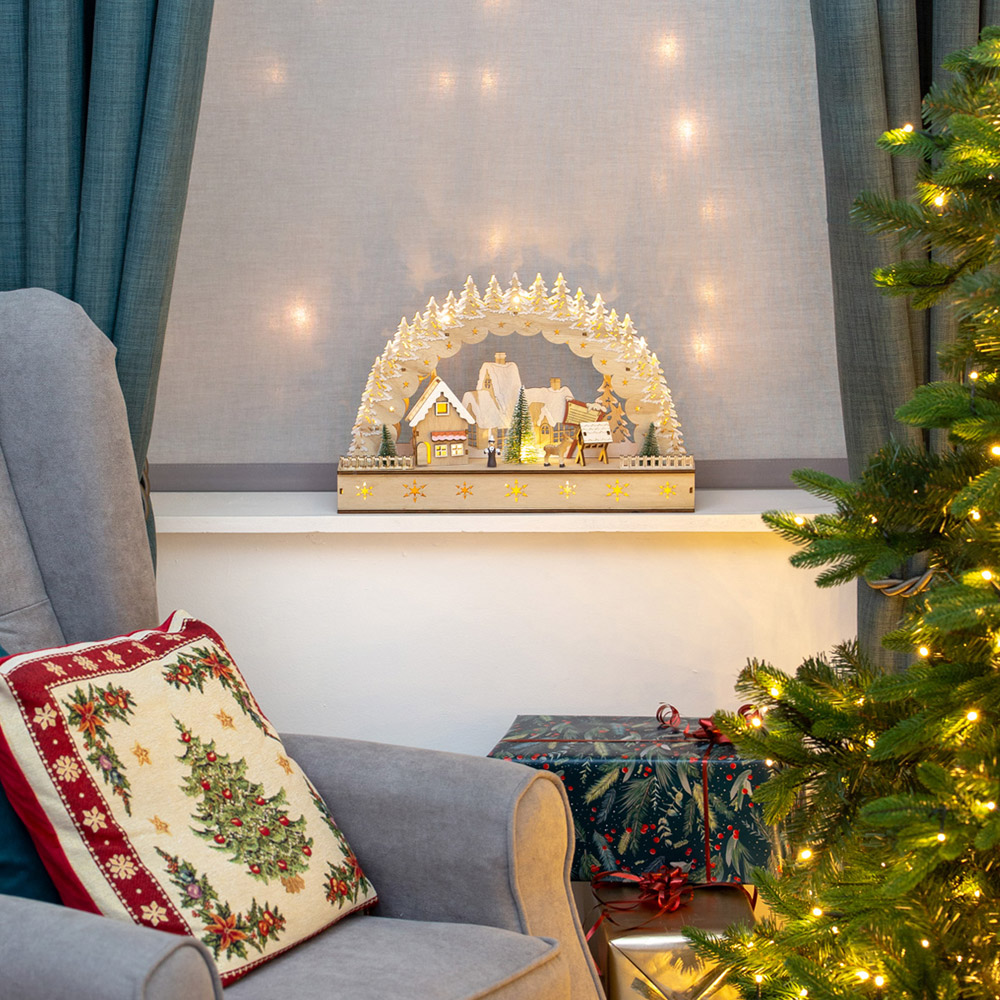 Bring a traditional Christmas feel to your home with The Christmas Workshop LED Wooden Christmas House Scene Decoration. This handcrafted piece features a detailed snowy village scene complete with houses, trees and a reindeer design. Thirteen warm-white LEDs illuminate the decoration, creating a festive glow. It also boasts a convenient timer function, allowing you to set the lights to shine for six hours each evening, automatically switching off for the remaining eighteen. Powered by 2 x AAA batteries (not included).